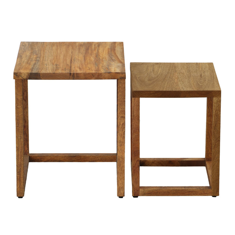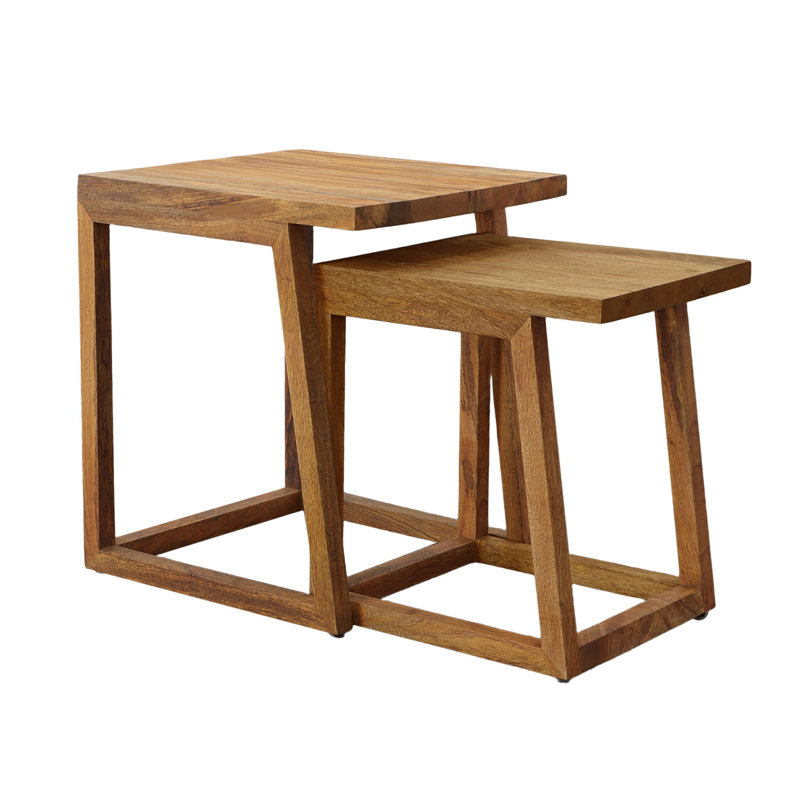 Space savvy and clean lined, this two piece wooden nesting side table set is sure to be a remarkable addition to your interior. Featuring replicated wood grain details for a natural appeal, it offers a wide rectangular tabletop to flaunt your collector items, vases, and showpieces. Handcrafted from mango wood frame, it is supported on geometric sled base. The warm brown accented wood finish allows the set to readily blend in with any decor setting. Be it your bedroom, living space or den, it makes a perfect addition to any place.