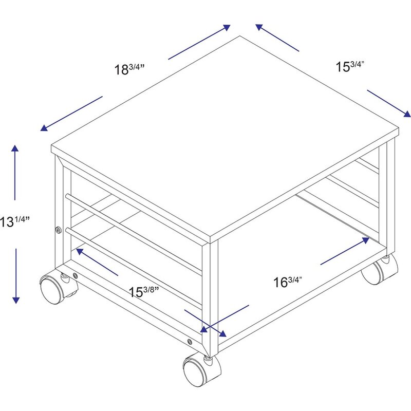 Underdesk Mobile Machine Stand easily rolls under your desk or beside it to hold your essential devices. Metal frame with black powder coating offers sturdy support. Top shelf holds up to 100 lb., and the bottom shelf holds up to 50 lb. The 3/5″ thick shelves feature a weathered charcoal laminate and PVC edge. Open back and sides allow easy cord management. Two of the four 2″ diameter, dual-wheel casters lock to park the machine stand where you need it.