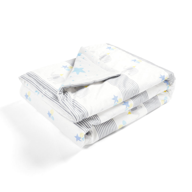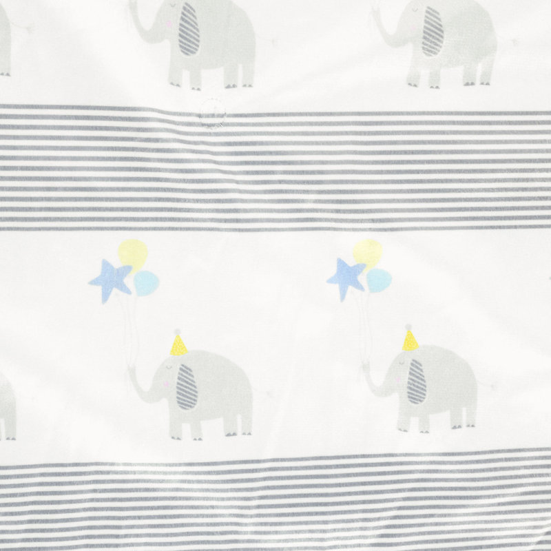 This reversible baby blanket features a playful pattern of marching elephants wearing party hats and holding a trio of balloons. Additional striped accents on the front and a mix of stars, dots, and balloons on the back complete the design. Made from a polyester fabric, it comes in gray, blue, and yellow hues over a white background. It measures 36″ wide and 50″ long, making this oversized blanket a great option for your little one’s crib or napping spot.