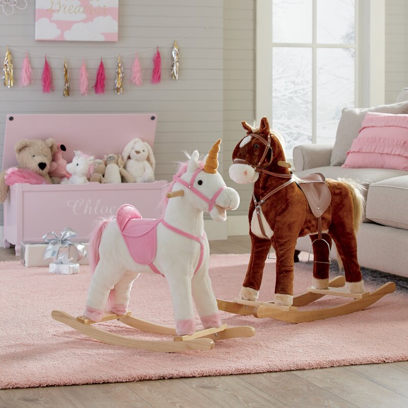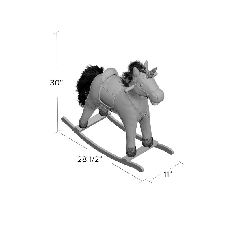 This Felicita Unicorn Rocking Horse will be a sure hit with any child and will be a favorite toy for many years to come. Soft and plush to the touch, this rocker has a handmade wooden core that keeps the unicorn and your child upright as they rock. Two wooden rockers create the rocking base, and two handles up top give your child a place to hold on to as they play. To assemble all you have to do is attach the base and handles.