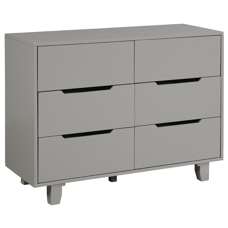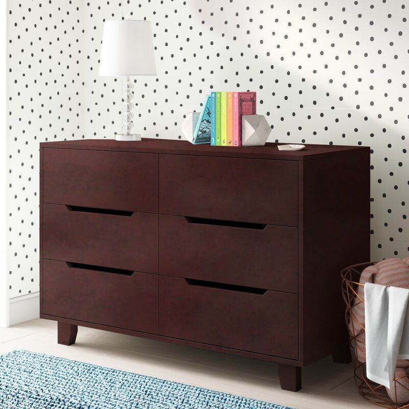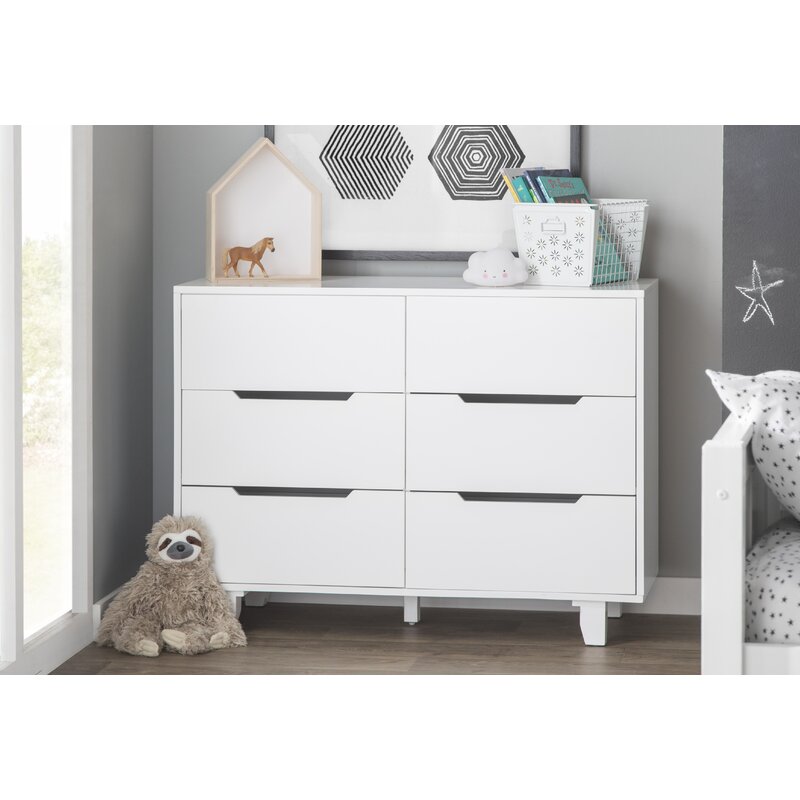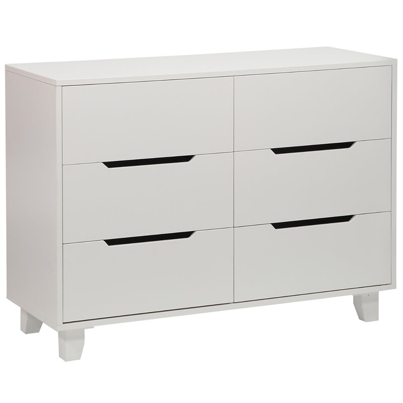 This 6-drawer double dresser helps keep your little one’s bedroom (or any bedroom) organized and clutter-free. Full of clean lines and ultramodern style, it’s made from engineered wood with a sleek, solid finish that blends in with almost any color palette. The drawer fronts feature open cutouts for handles, and they rest on metal glides for easy opening and closing. Measuring 45″ wide and 18″ deep, this dresser also provides ample surface space for family photos, artful accents, and other accessories. A wall anchor is included for extra safety and security.