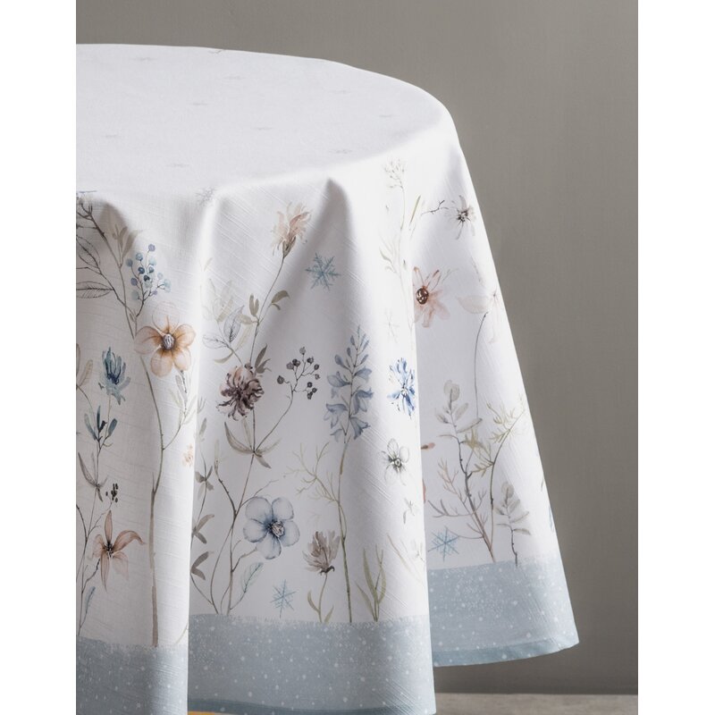 A delightful print with inviting florals and foliage adds a bit of excitement to your table. Snow crystals adorn the center of the table with simple yet striking floral patterns decorating the sides in a wintry design which is set against a white background. This tablecloth is a piece of art in itself and would be a great way to infuse your home setting with charm and color. Mix and match similar prints from the same collection and combine different colors to add a bit of depth to your table decor.