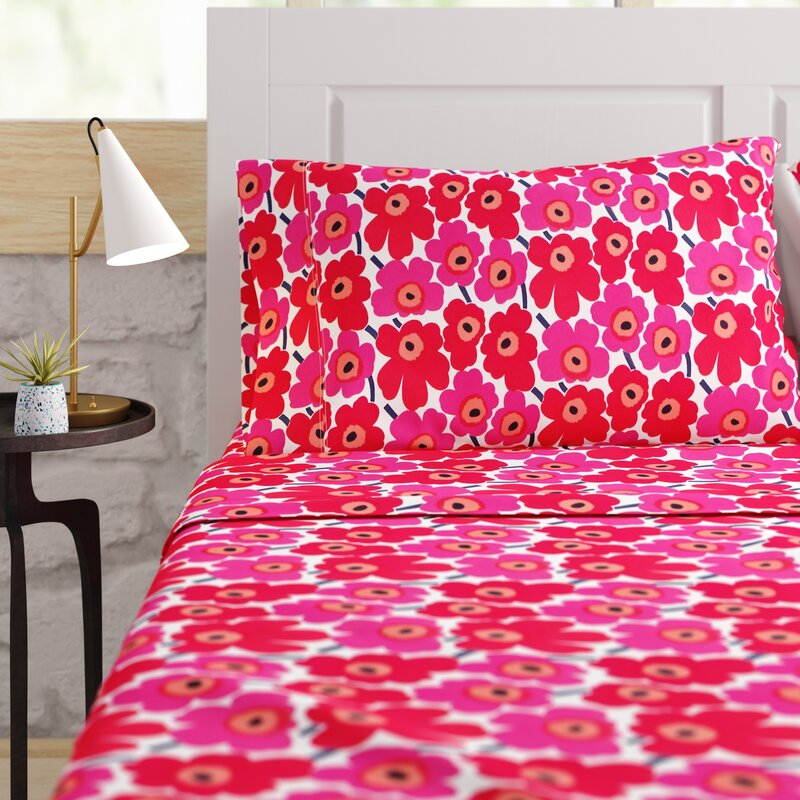 Inspired by the first collection designed by Marimekko, the Mini Unikko sheet set pays homage to this classic poppy pattern that will make a bold statement in your bedroom. Soft cotton provides a soft and comfortable sleeping surface.