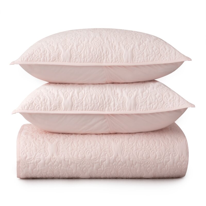 I am very happy with this quilt set. It is a very pretty pale pink. I like the quality of it it. It looks and feels pretty nice. The only possible complaint would be that it’s good for the summer, not cold nights, unless you have another blanket with it. Very pretty.