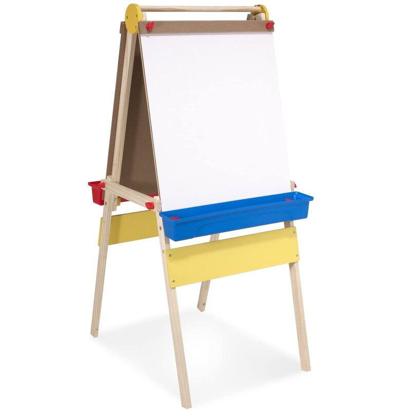 Help spark creative expression in your budding artist with this generously sized, deluxe wooden easel featuring both a magnetic chalkboard and a dry-erase board. The removable plastic trays mean that kids have loads of easy-reach art supplies (not included) at their fingertips. Plus 39 letter and number magnets that are great for extended play!