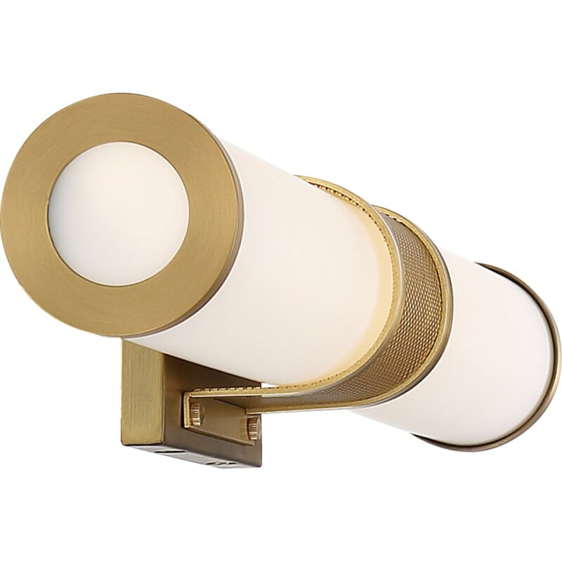 Vanity light with a contemporary design features a brushed brass finish and frosted acrylic lens