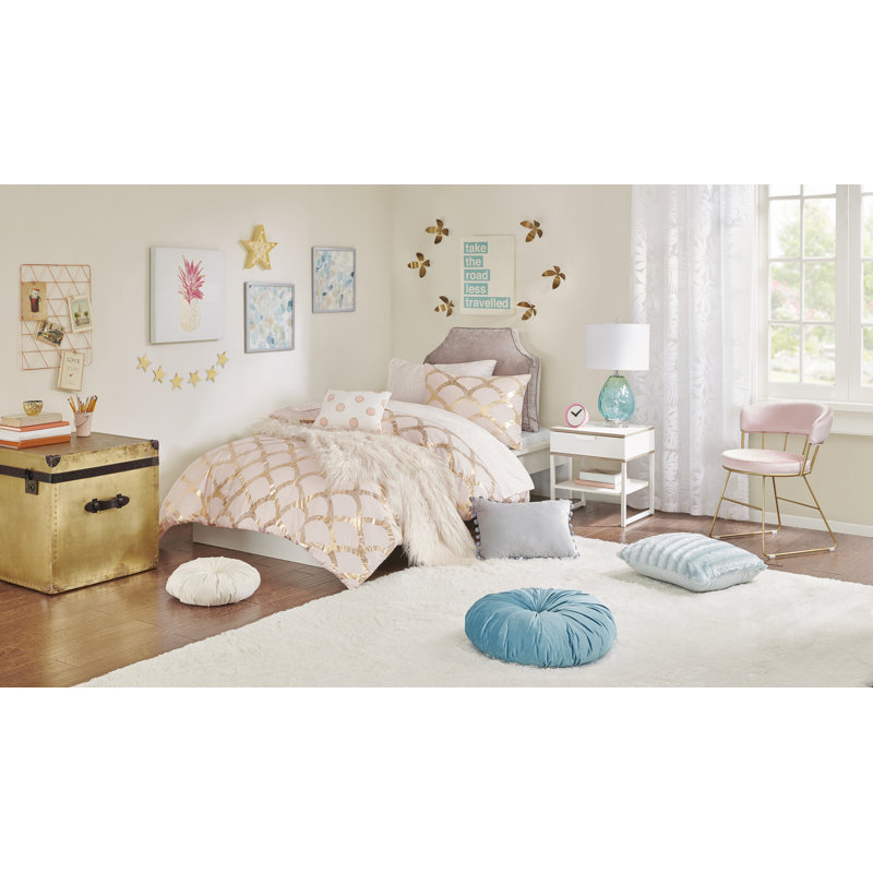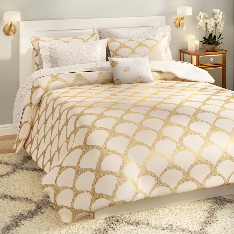 Give your bedroom a modern flair with the Nasir Metallic Scallop Print Comforter Set with Bed Sheets. A solid reverse matches the face of the comforter, while a decorative pillow adds a charming touch. Also included is a complete sheet set that complements the rest of the comforter set. This comforter and sheet set is made from ultra-soft material to provide exceptional comfort for a restful night’s sleep. This bedding set uses an antimicrobial treatment that provides built-in freshness protection, reducing the growth of odor-causing bacteria to keep the fabric last longer.