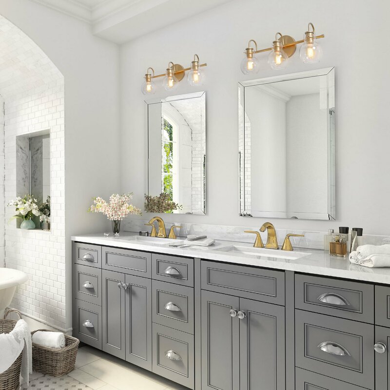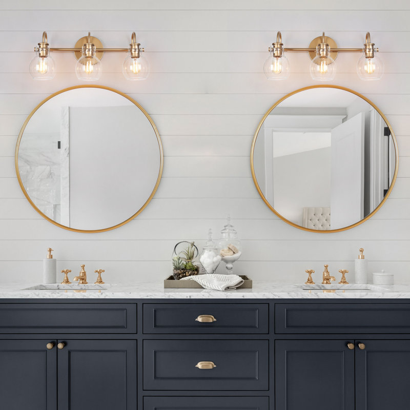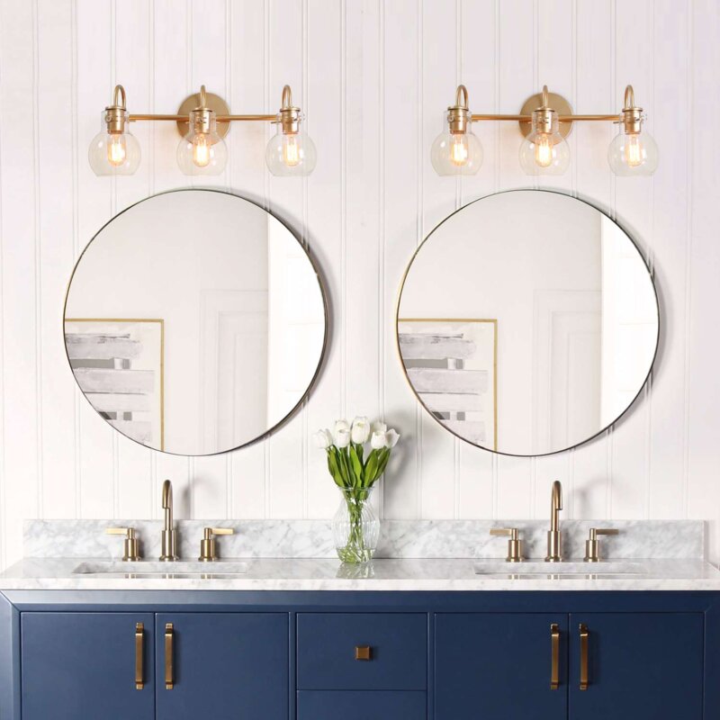 BEAUTIFUL! bought two for double sink vanity, placed atop shiplap. much lighter in weight than anticipated, pretty color – not “yellow brassy”. straightforward installation. the glass globes were bubbled and I wouldn’t have opteddesired it… but, not a problem at all. still beautiful, would absolutely recommend.