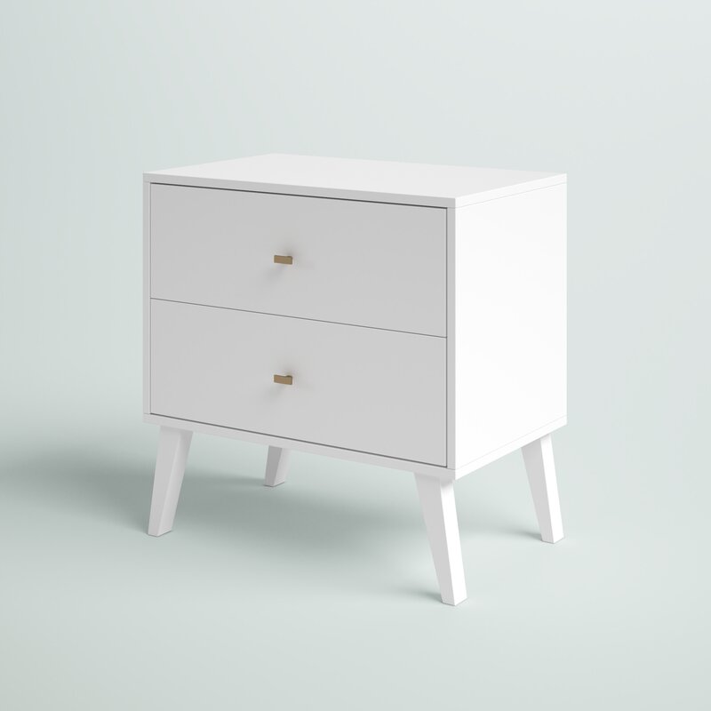 This 2-drawer nightstand brings a mid-century modern design to your main bedroom or guest room. Its frame is made from engineered wood in a variety of finishes to choose from, and it has sleek, tapered legs for a retro-inspired look. The two inset drawers feature removable brass-finished metal knobs and open up on roller glides to reveal space for remotes, reading glasses, and books. Plus, we love that the 22.5″ wide surface gives you just the right amount of room for a lamp and framed photo.