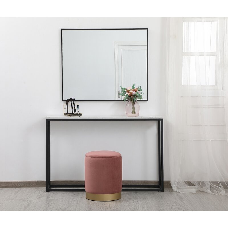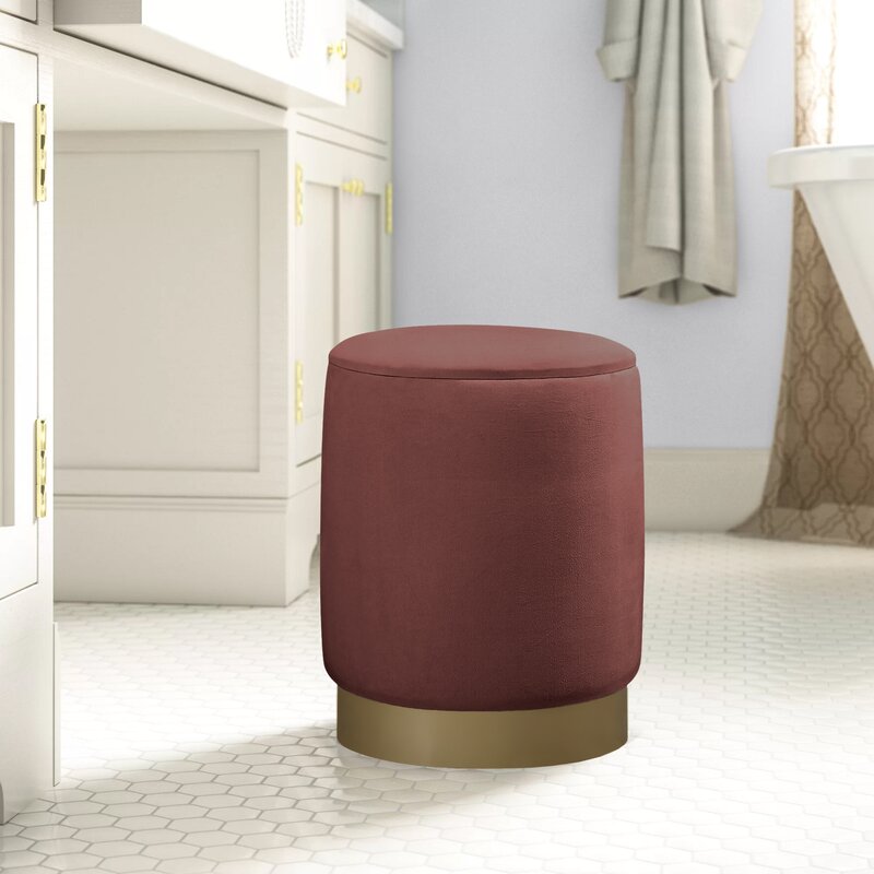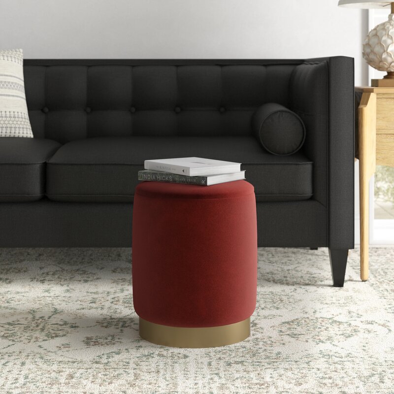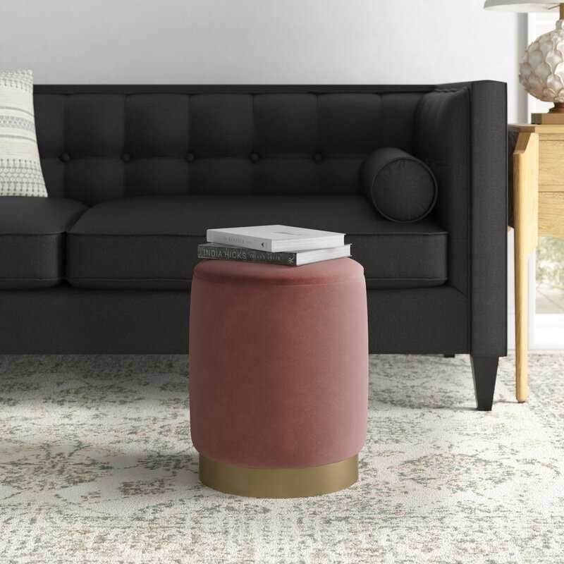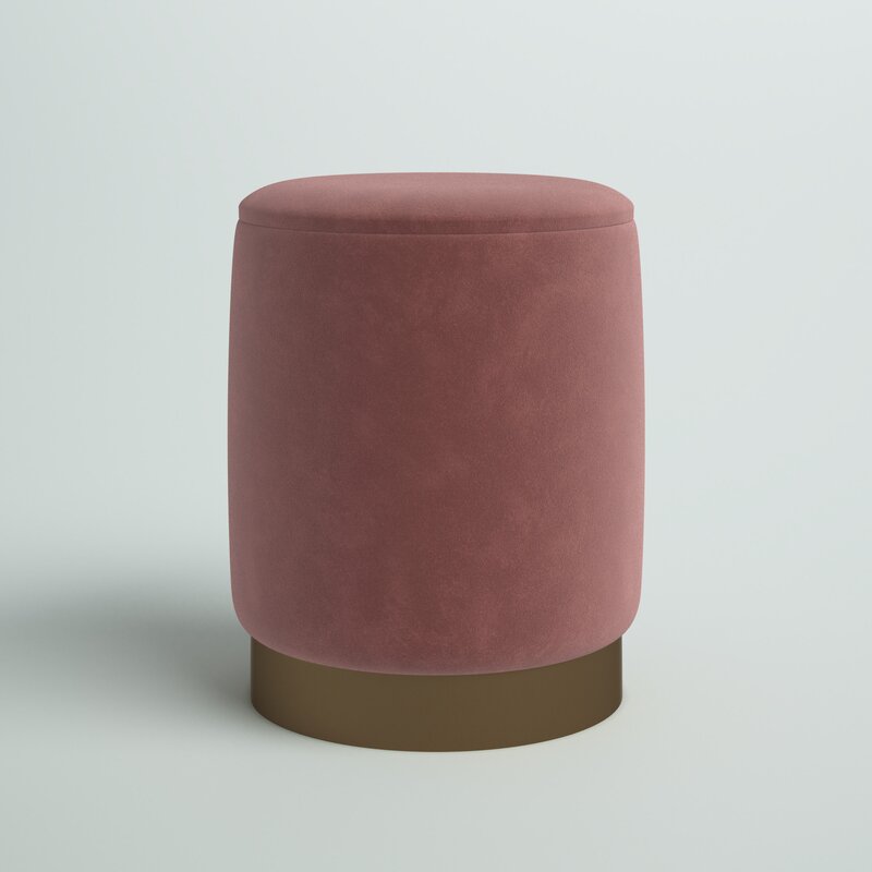 This ottoman provides a clean-lined spot to rest your feet and store extra throw blankets. It’s built with an engineered wood frame and has a cylindrical silhouette with a gold-finished plinth metal base. This ottoman is wrapped in polyester in the bright or neutral color of your choice. The seat can lift off to reveal a storage spot where you can keep blankets or pillows. It measures 14″ in diameter, making it ideal in seating areas that are lacking floor space.