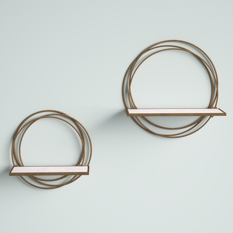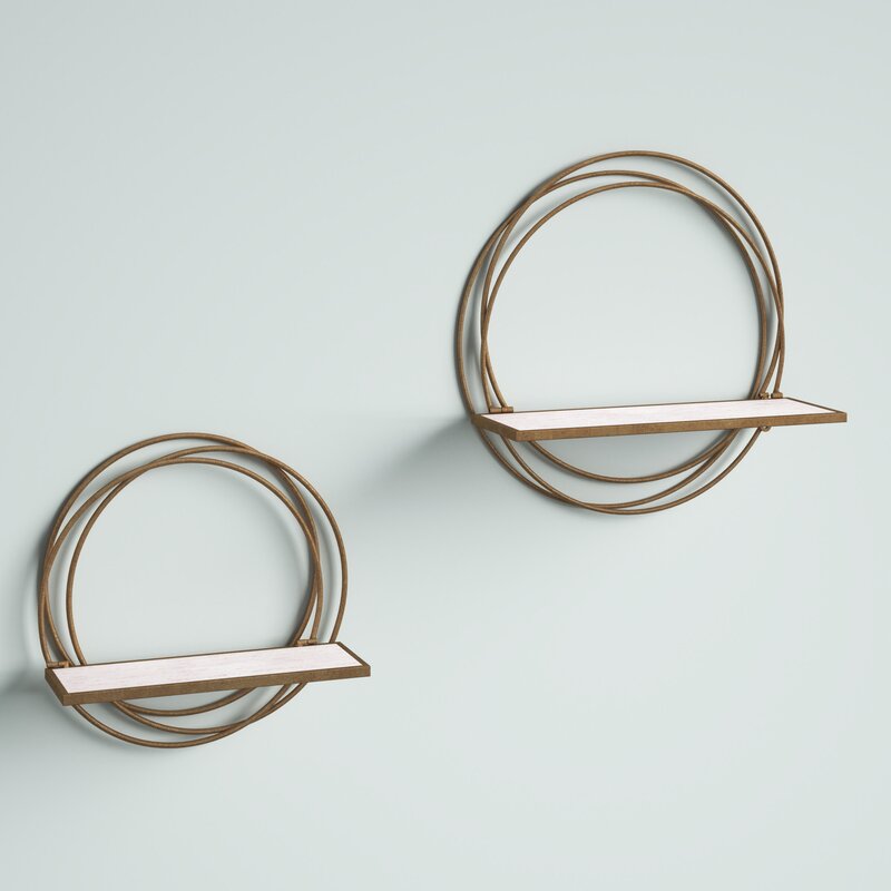 Rustic charm meets contemporary design with these must-have wall shelves. The shelves are made from solid wood in a whitewash finish for some farmhouse inspiration. Supporting the shelves are metal rings in a sleek gold finish that let your wall color pop through for an open, modern silhouette. Arriving in a set of two, the shelves measure 13.75″ and 12.25″ wide.