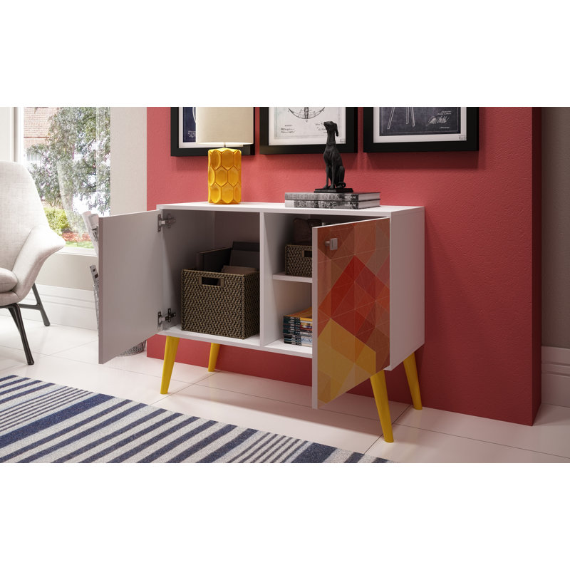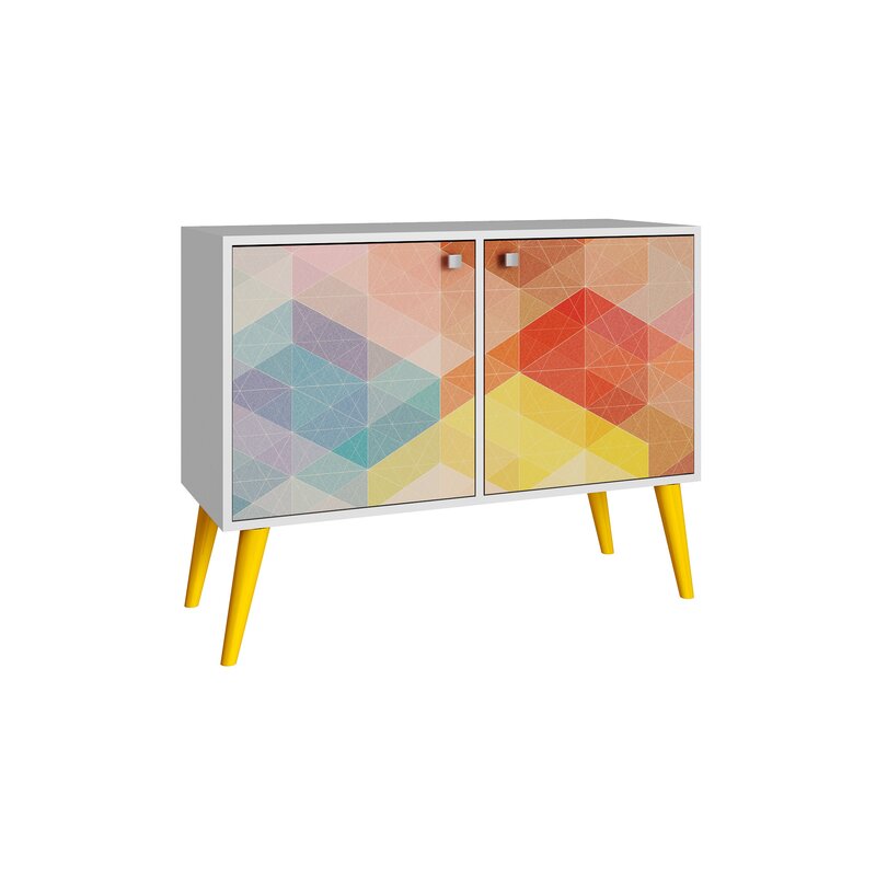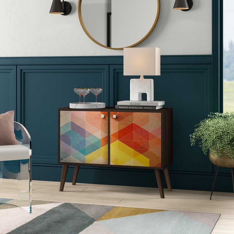 This 2-door accent cabinet blends minimalist, modern design with a splash of vibrant color for a lively addition to your living room or bedroom. It’s made from melamine wood and particle board, and it stands on top of four round, tapered legs in your choice of finish for a hint of mid-century modern flair. Two visually stunning cabinet doors display a geometric print in a rainbow of colors, opening to reveal shelved storage for everything from books and board games to stemware and place settings. This cabinet requires full assembly, so make sure to get your screwdriver, power drill, and hammer ready.