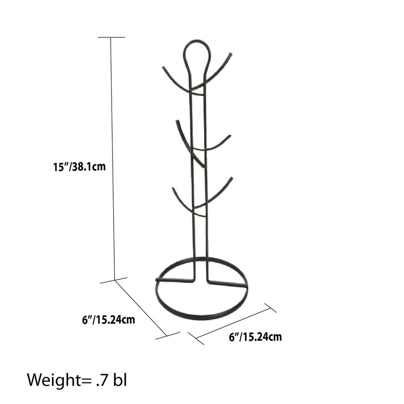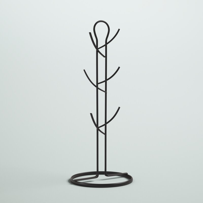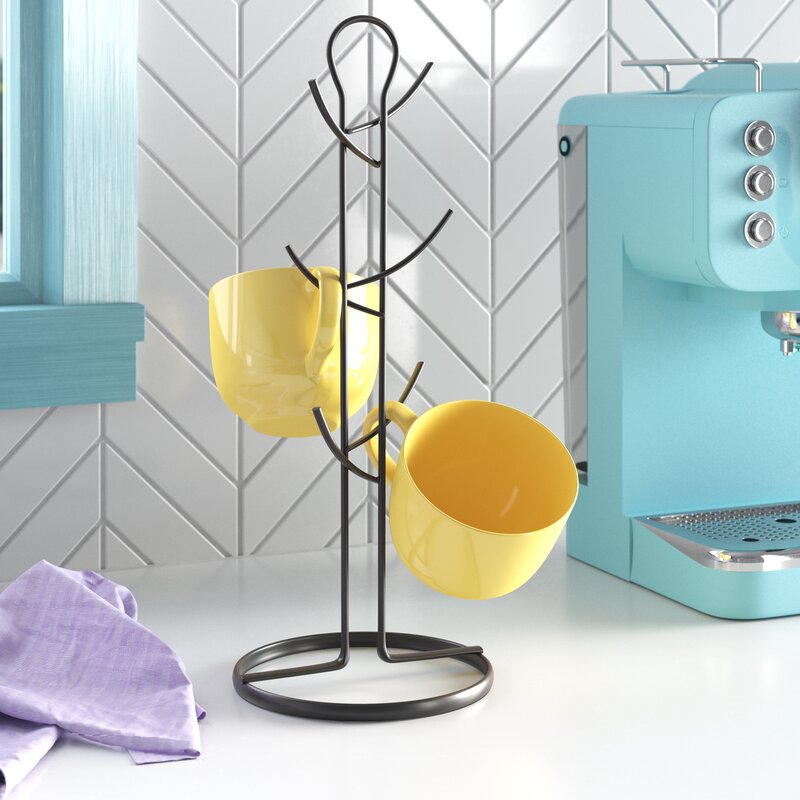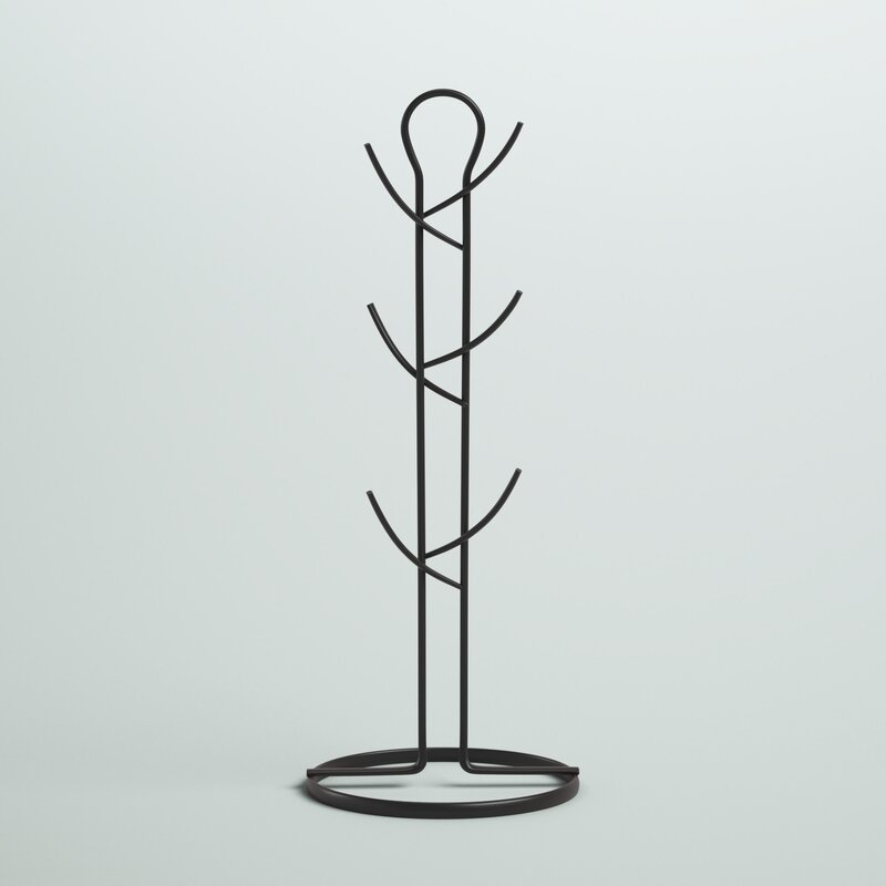 This mug tree is a great storage solution for your sideboard, server, or kitchen countertop. Minimalist in design, it’s made from metal with a solid black finish for a sleek modern look. Six delicately curved branches sit attached to the central looped rod that rests upon an open round base. The slender branches make it a cinch to hold your favorite mugs, so they’re easy to use for your morning coffee or tea. Plus, it doubles as a decorative rack for jewelry and other accessories. Simply hand-wash when it needs a quick clean.