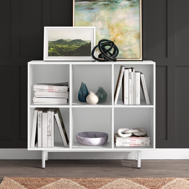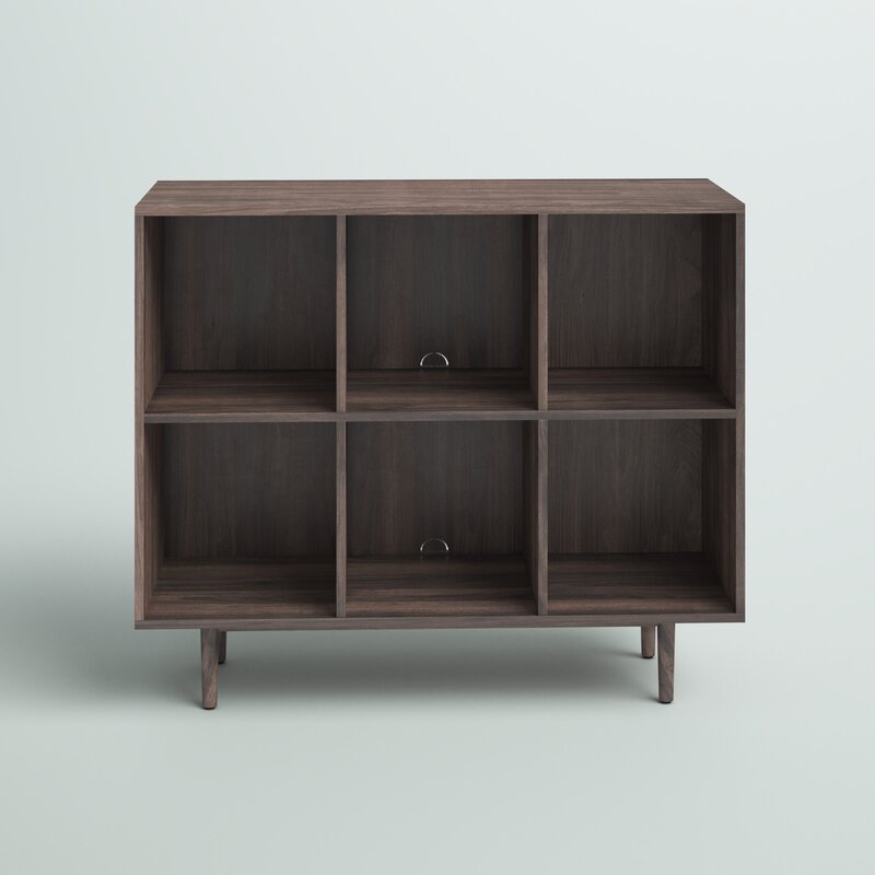 This cube bookcase features clean lines and a modern-inspired silhouette for your living room or den. It has a solid and engineered wood frame with a neutral finish, and it rests on tapered dowel legs for a mid-century look. Six square-shaped cubbies are sized to fit standard vinyl records and books. Plus, two perforated cord management holes give you the option to use this bookcase as a media center. There’s plenty of space on top for your record player and speakers, or a variety of decorative pieces. Full assembly is required.