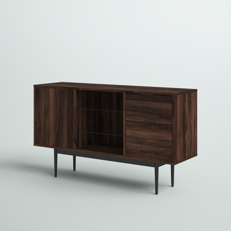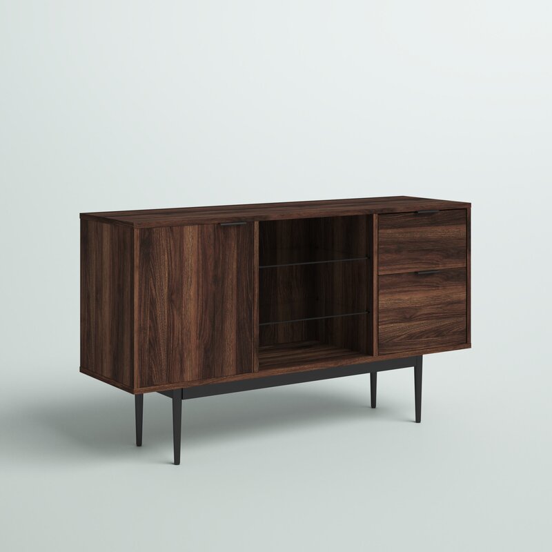 This sideboard brings storage options and mid-century style to your bedroom, living room, or den. It’s made with engineered wood in a clean-lined buffet style that complements cozy interiors. This buffet table features two drawers, three clear glass shelves, and one cabinet for maximum storage options. The rectangular top sits on tapered legs for a vintage look. We love that this sideboard table has a cable cutout in the back in case you want to store entertainment systems, speakers, or other tech items on the shelves.