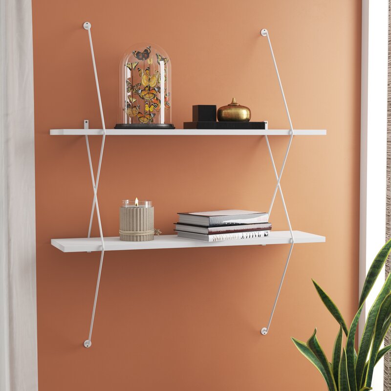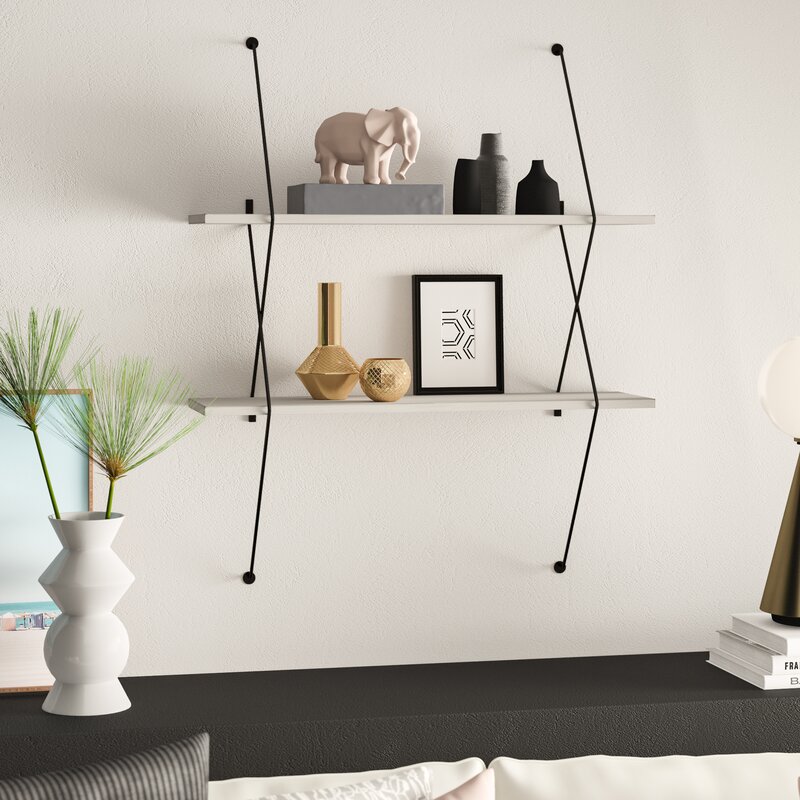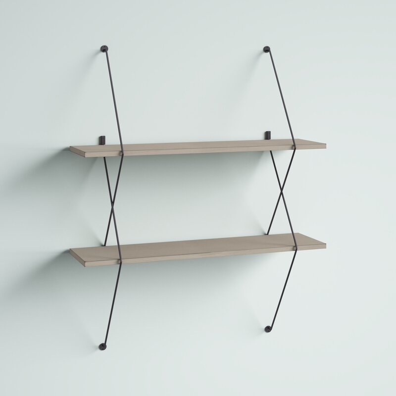 Equally ideal for storage and staging, this handy shelving system is an artful accent all on its own. It’s crafted from laminated engineered wood in a gray and black or white finish for a two-tone look. It offers up two tiers of clean-lined wood shelving and features black wire connectors with a crisscrossing X design. Simply mount it to your wall for a bold floating look that keeps your favorite books, potted plants, and framed photos close by.