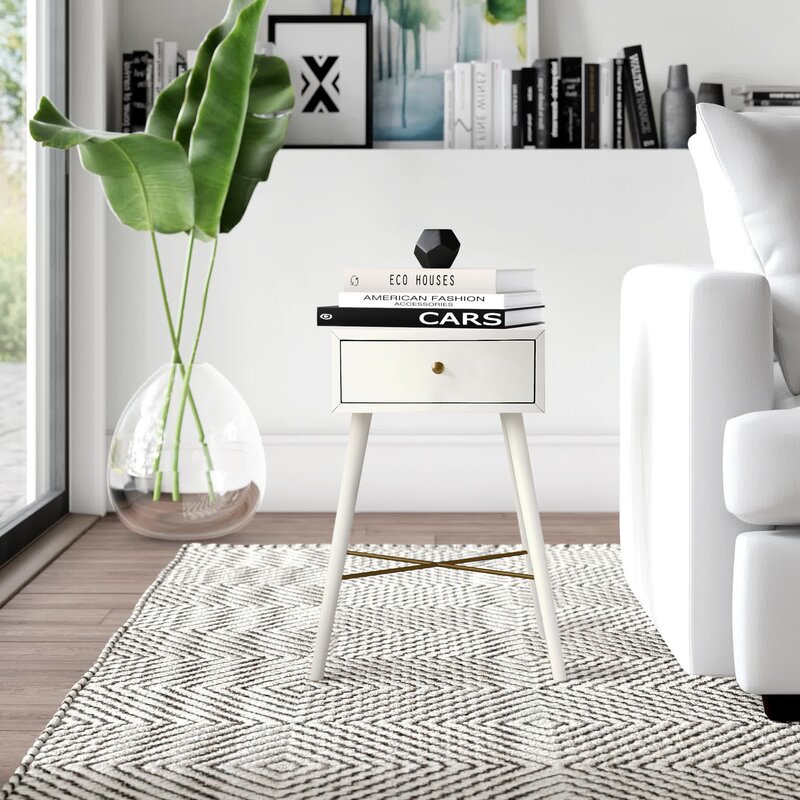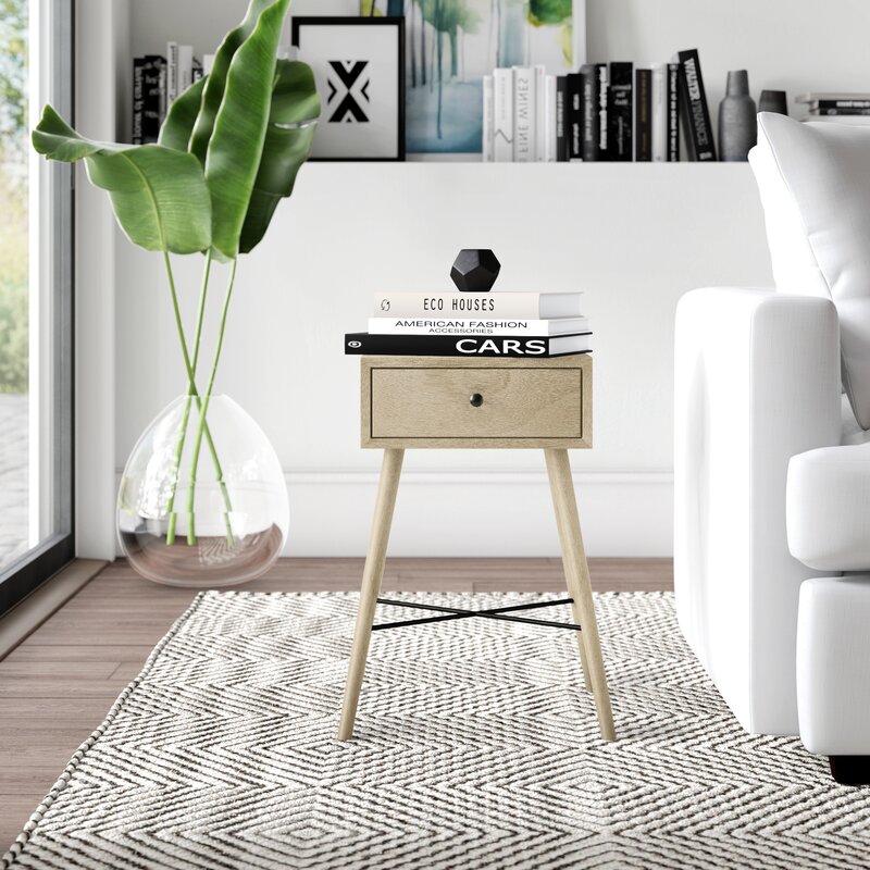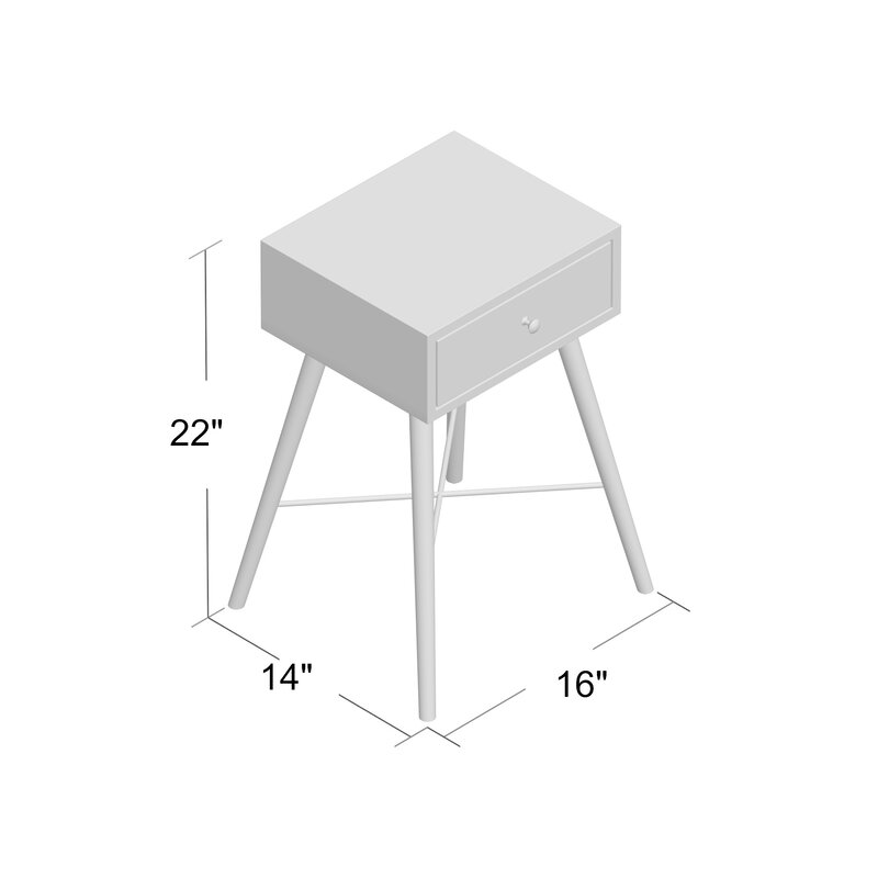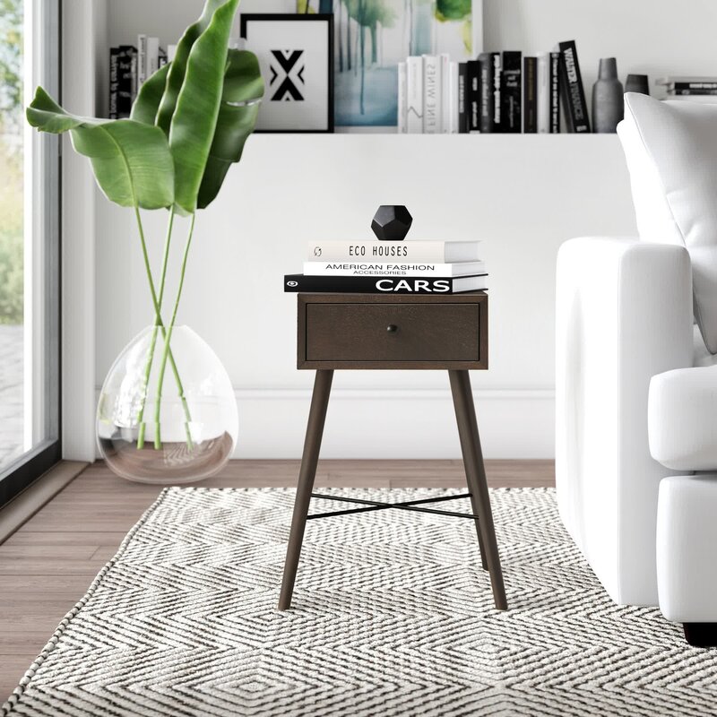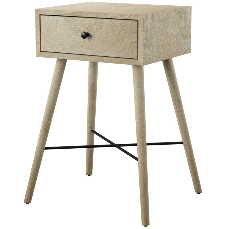 Drawing inspiration from mid-century modern designs, this clean-lined end table is a stylish sidekick for any sofa, seat, or bed. The frame is made from solid and engineered wood with a weathered finish, and it’s built on four slightly splayed legs connected by a cross support brace.. A single drawer provides out-of-sight storage for reading glasses, books, and other odds and ends you want to tuck away. This compact end table is a fine fit for narrow nooks and cramped corners. Plus, it arrives fully assembled, so you don’t have to break out your toolbox.