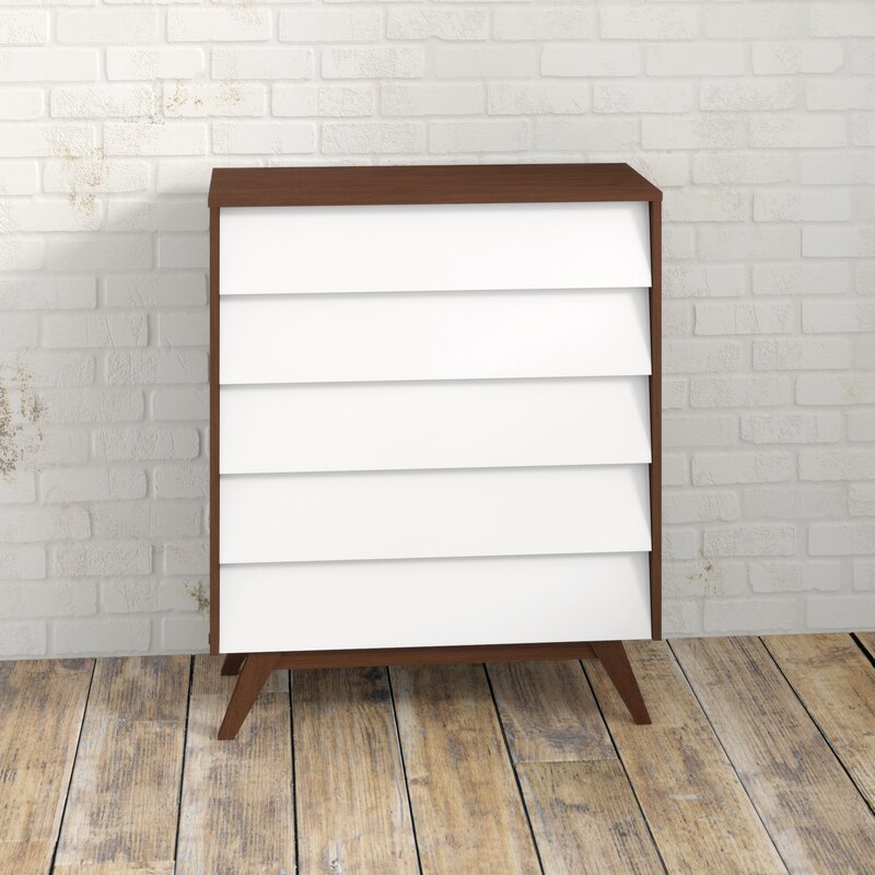 This 5-drawer dresser streamlines your teen’s room with a sleek design and extra storage. It’s made from engineered wood with a frame in a brown walnut finish. The five clean white drawers give your teen lots of room to organize their wardrobe or tech. Handle-free drawers and flared feet complete the mid-century modern style. This dresser has a finished back, so it looks just as good up against a wall as it does in the center of the room.