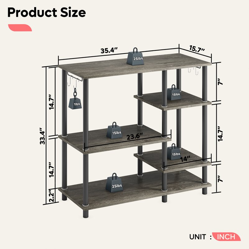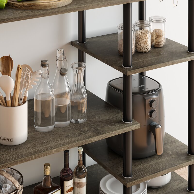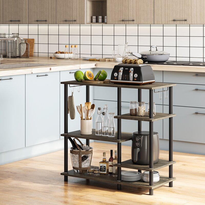 This baker’s rack creates the ideal coffee station, bar storage, or prep area for your kitchen. It has a modern-inspired tubular steel frame that supports five separate engineered wood shelves of varying lengths and heights, making it a cinch to organize all your appliances and dining essentials. Four hooks let you hang some of your often-used utensils, while a spacious top is just the right spot for a microwave and/or your espresso machine. Full assembly is required.
