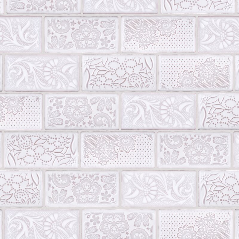 Bring unique vintage accents to your home with the tile. These embossed floral subway tiles feature uneven edges for a handmade look. There are up to four varieties of unique floral and lace patterns randomly assorted within the case for endless design possibilities. The unique coloring, which features different shades that gradually darken around the edges, creates a rustic look. The reactive glaze on this tile makes every piece unique, so you will never have two that are the same. Use these subway tiles as an accent with many of our other products, including those in this collection, to complete an elegant look.