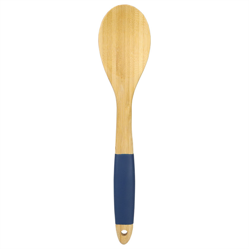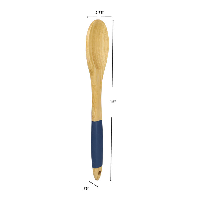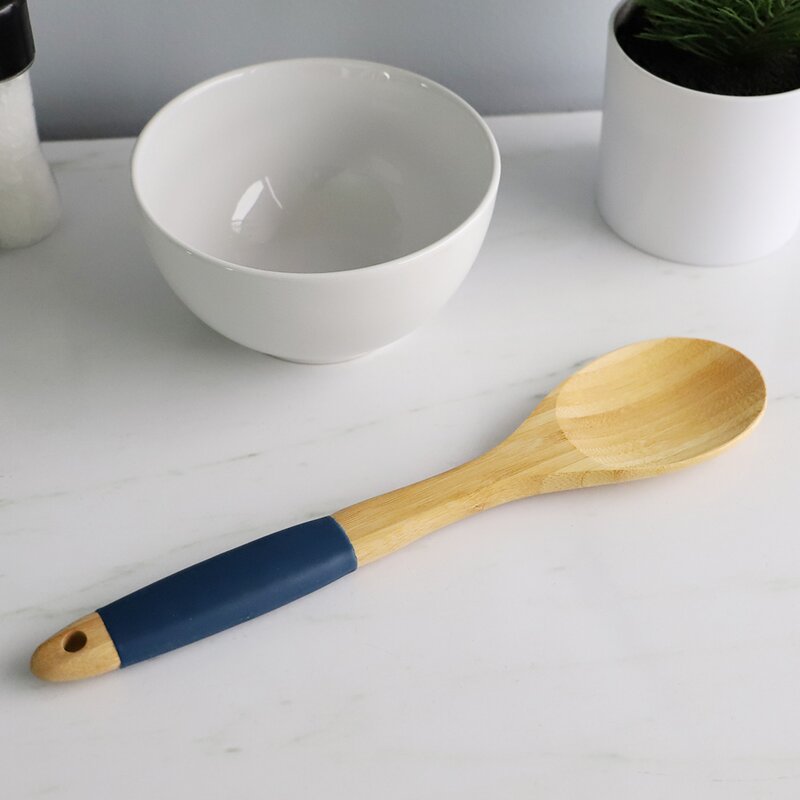 Well-balanced and sturdy, this long, bamboo spoon makes stirring a resilient stew with ease. Perfect for big bowls of batter and cookie dough, too. Safe to use on all types of cookware and bakeware, including non-stick. Rubber grip handles provide a solid grip while in your grasp. Opening in the handle to hang on a kitchen rack when not in use. Item dimensions may differ slightly due to the unique nature of the product. Color and finish may also differ from the images shown due to differences in monitor displays. Props and accessories are not included.