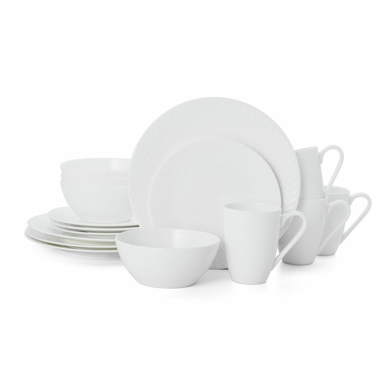 Contemporary design on classic white makes dinnerware a timeless collection ideal for both casual entertaining and everyday dining. Adorned with a stylish, embossed basket weave pattern, this chip-resistant bone china brings a unique look to the table, yet complements your favorite flatware and stemware perfectly. This 16-piece square dinnerware set includes 4 each of 10-1/2 inch dinner plate, 8-1/4 inch salad plate, 6-inch cereal bowl, and 13-ounce mug.