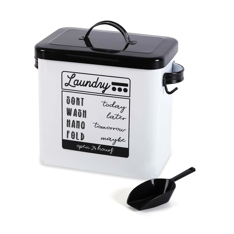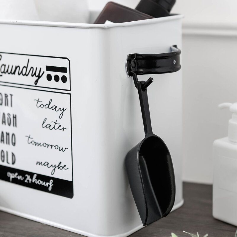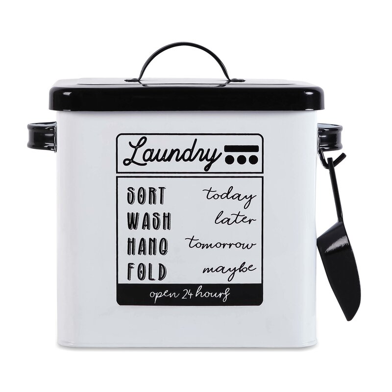 Make laundry fun with our Laundry Detergent Powder Storage Tin Box. Made with metal and laundry text design, this storage container features a removal lid,a handy matching scoop and side carry handles with classic black and white finish. Perfect for storing laundry supplies or other items around the kitchen, utility room or laundry room.