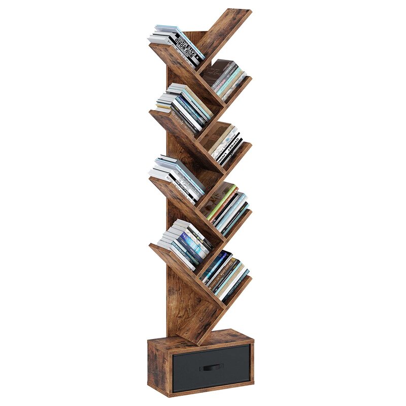 Our 8-tier free-stand tree is durable and offers enough space to hold a stack of your books, magazines, or decors. It is a nice shelf that can fit narrow corridors and room corners or walls. The tree-shaped bookrack looks like a tree, and the roots of the ensemble are represented by a spacious bottom drawer with a sturdy base. Save you from finding a book from a stack of things with a total opening and displaying design.