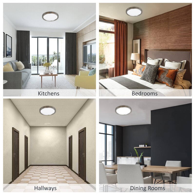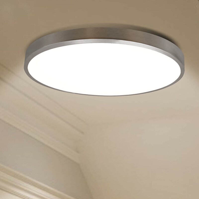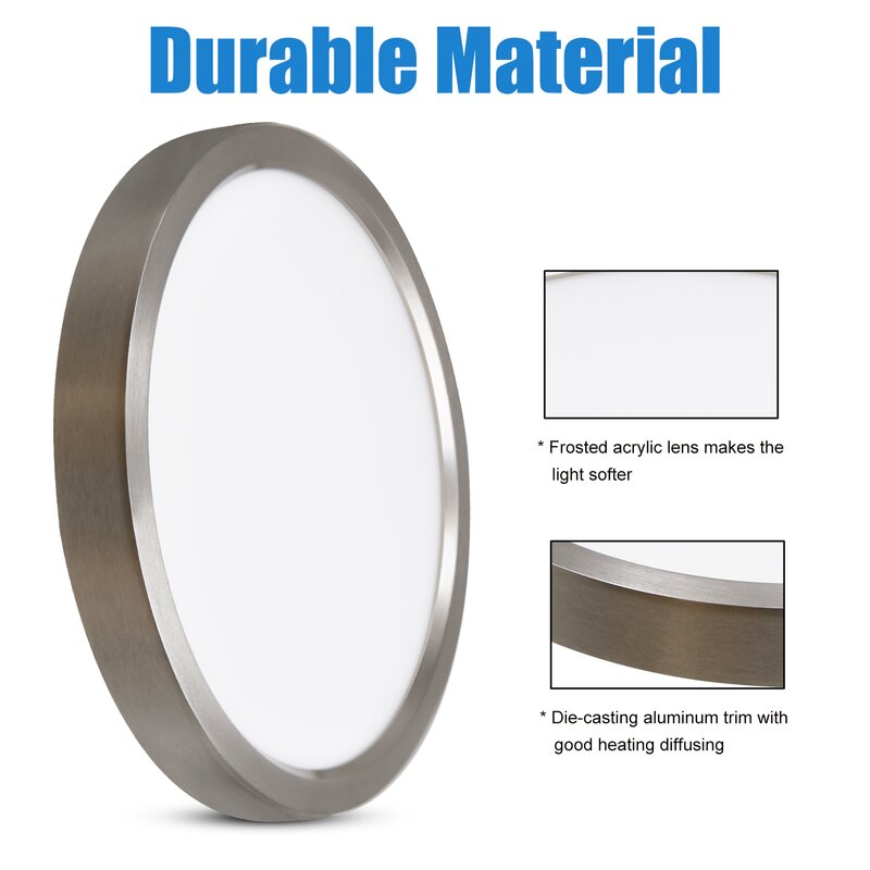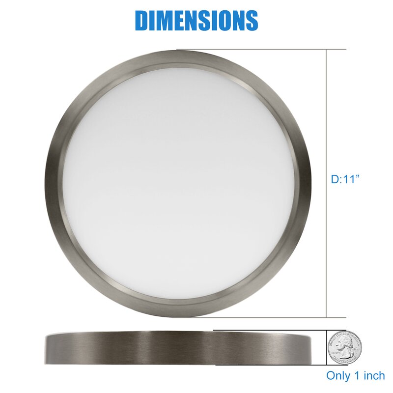 11-Inch Dimmable round LED flush mount; Finished: Brushed nickel and acrylic; Size: 11″*1″120V 15W 1000LM C.T.:3000K, CRI 81, ETL ES listed.