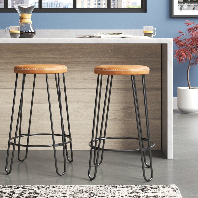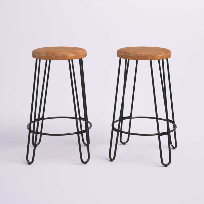 We love the sleek, industrial look of this set of two counter stools. The angular bases are made from powder-coated steel in a metallic gunmetal hue and are bound by a ring near the base. We love the protectors on the legs that help prevent your floor from getting scratched and scuffed. The round seats are solid wood in a walnut hue. Best of all, the backless design allows you to tuck them right under the counter or table for space-saving efficiency. Full assembly is required, but the good news is all tools are included.