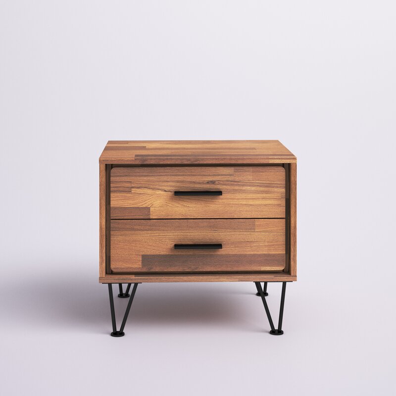 Defined by its low profile and minimalist design, this clean-lined nightstand brings a bit of flair to your bedroom. Founded atop four metal hairpin legs, this budget-friendly piece is made of manufactured wood and particleboard in a neutral finish that’s versatile enough to complement most color palettes. provide a place for books, vitamins, and other bedside essentials. This compact design is an ideal option for a smaller space.