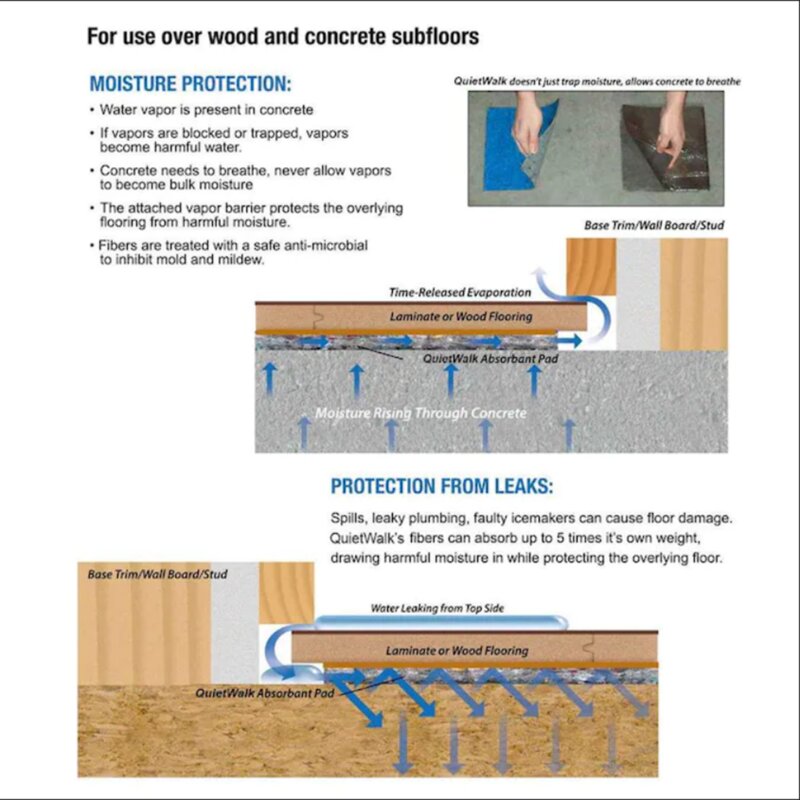 Moisture protection recycled fibers allow installation over concrete to & manage vapors from becoming bulk moisture. The attached vapor barrier protects the overlying floors from harmful moisture.