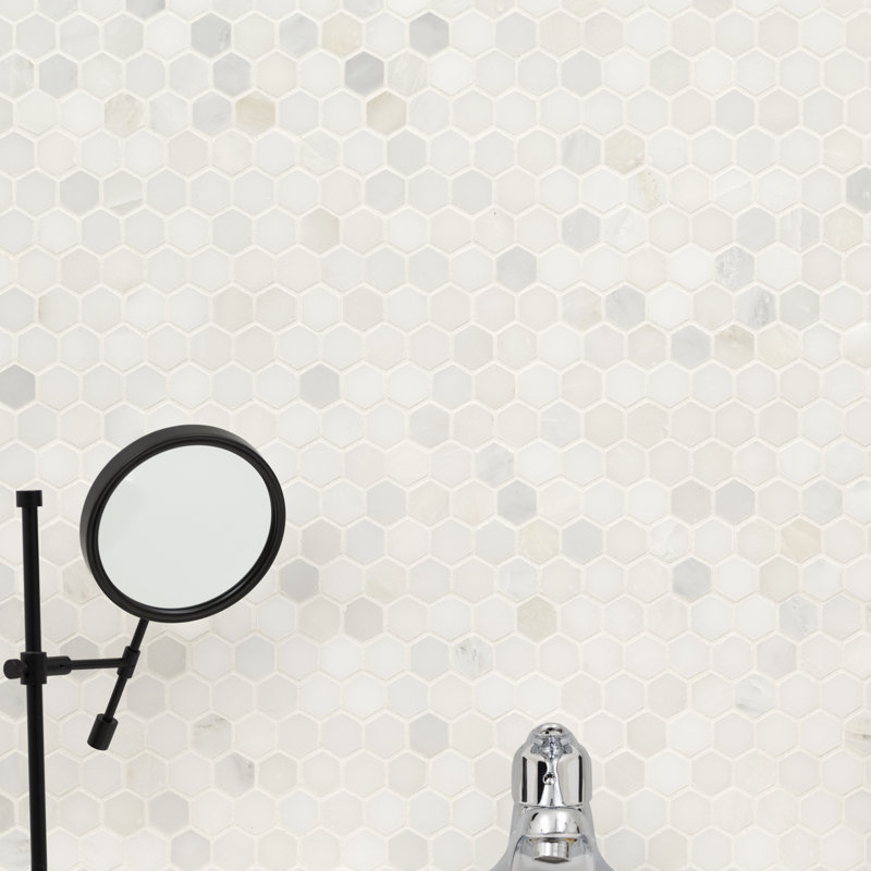 Arabescato Carrara hexagon mosaic tile is a classic white and gray marble tile that comes in 12×12 mesh-backed sheets with 132 chips per sheet. The timeless backsplash tile has a honed finish for a softer, more natural look, and it’s a super chic choice for a hexagon tile backsplash or hexagon bathroom tile for floors, countertops, and walls. Note: Inspect all tiles before installation. Natural stone products inherently lack uniformity and are subject to variation in color, shade, finish, etc. It is recommended to blend tiles from different boxes when installing. Natural stones may be characterized by dry seams and pits that are often filled. The filling can work its way out and it may be necessary to refill these voids as part of a normal maintenance procedure. All natural stone products should be sealed with a penetrating sealer.