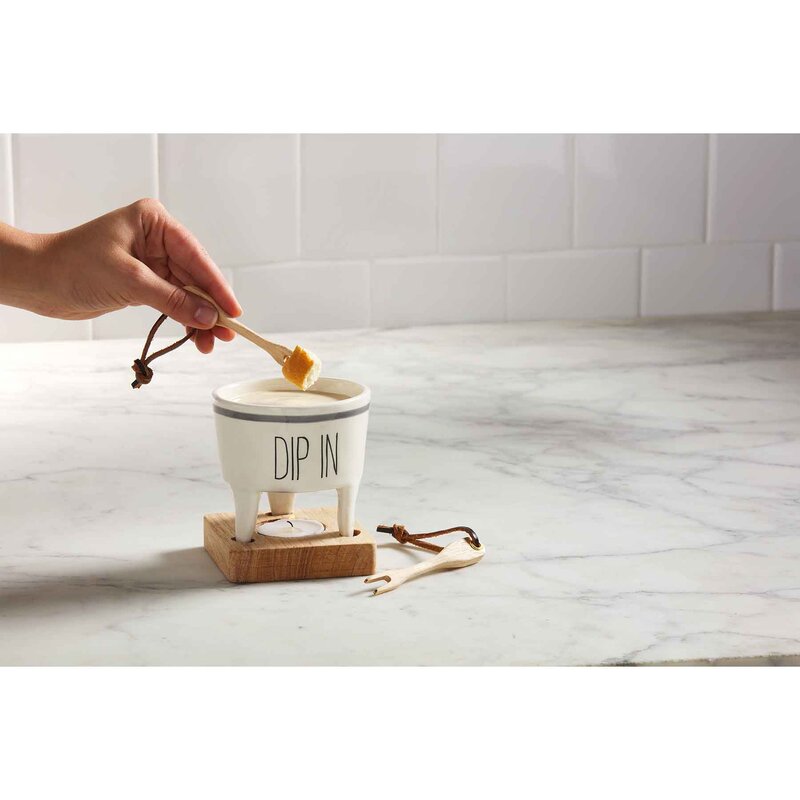 This four piece set comes with a hand-painted ceramic fondue dip bowl that reads “DIP IN.”
