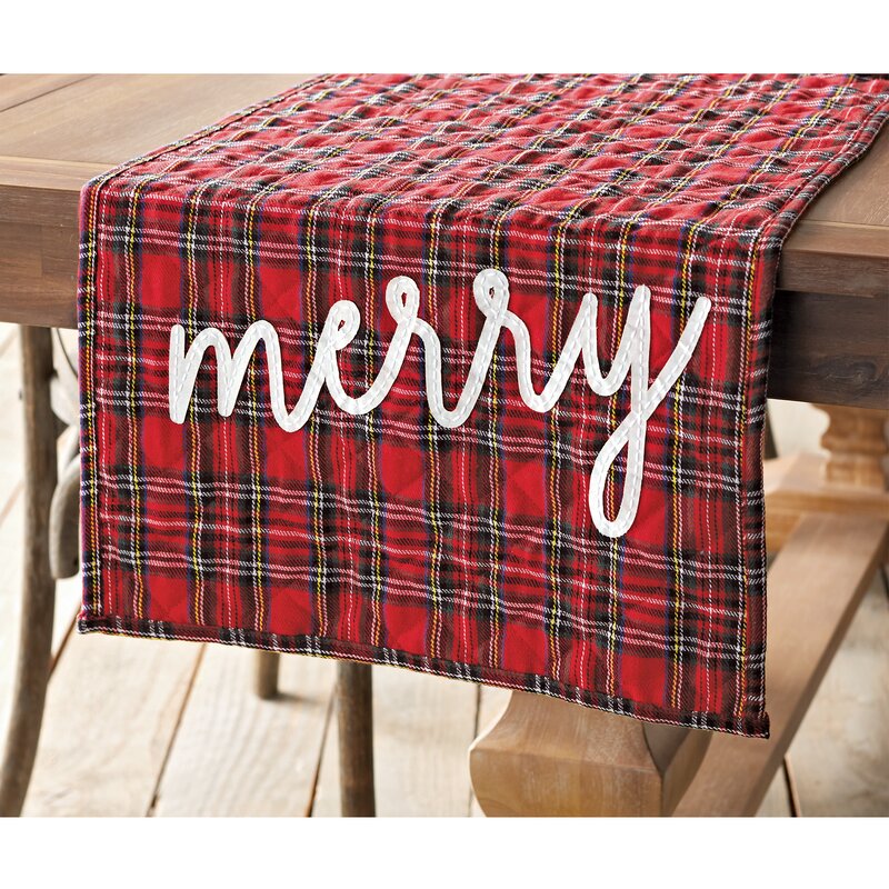 The runner also features contrast embroidered sentiment that reads “merry” in white writing on each end.