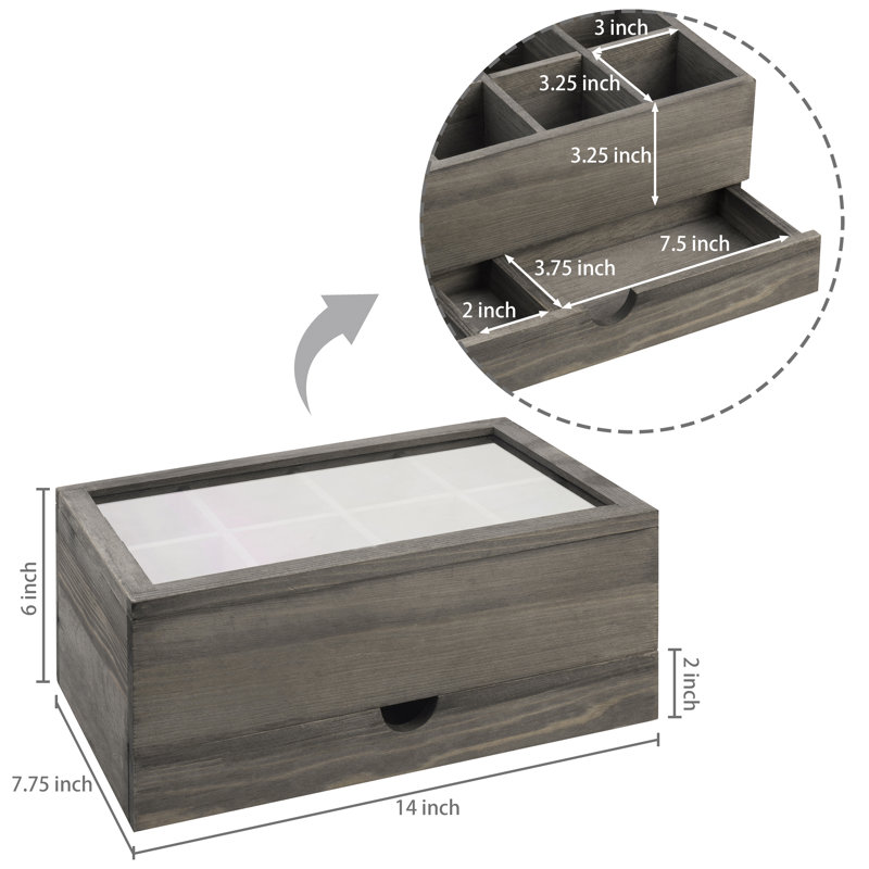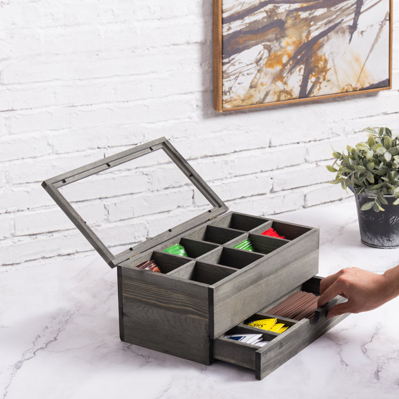 This charming rustic wood organizer storage box provides 8 slots on top for storing tea bags, sugar packets and coffee capsule pods; its bottom pull-out drawer provides additional space for keeping stirrers, creamers, and other accessories organized. Easy to keep on any table or counter top surface, its clear acrylic lid allows you to easily view the storage case’s contents so that you always know when it is time to replenish supplies. This tea bags organizer includes a hinged lid with magnetic closure to keeps contents secure and easily accessible.