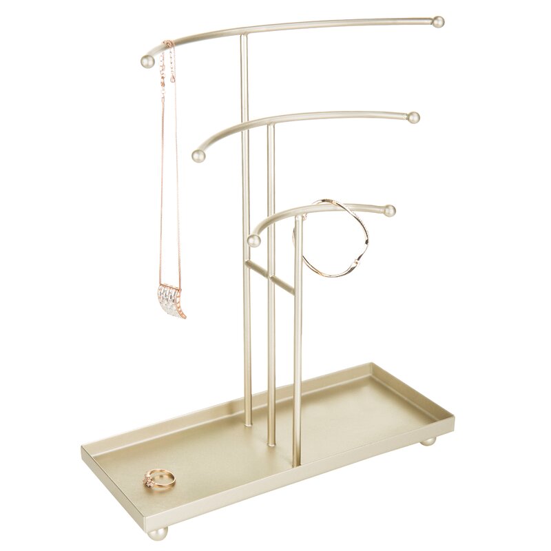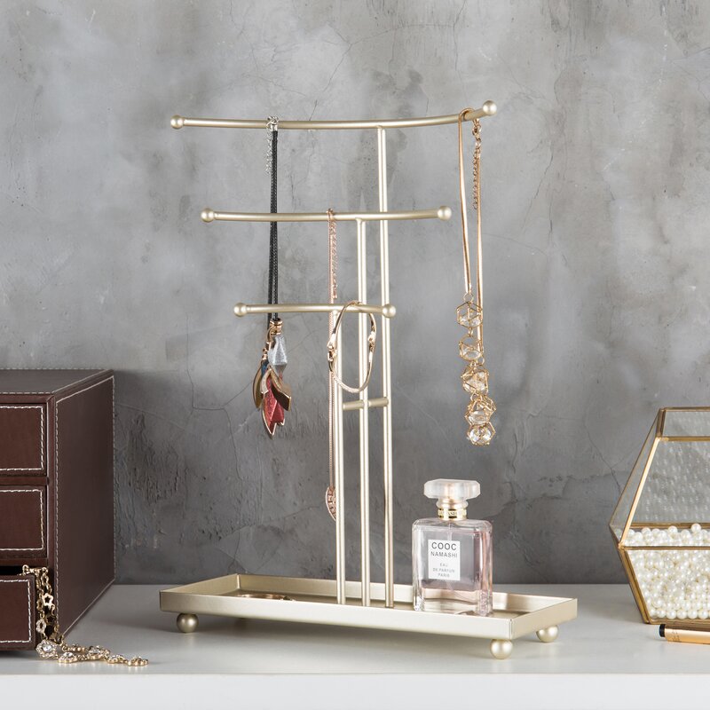 Highlight and organize your most treasured jewelry accessories with this stylish and elegant jewelry tree. The gracefully curved tiers make it easy to view each piece, and the top tier can accommodate necklaces up to matinee length (26 inches). A convenient 4-by-11-inch tray at the bottom provides plenty of space to store rings, clips, brooches, pins, and other small items. So keep your jewelry neat, tidy, and untangled with this elegant style tabletop jewelry display stand.