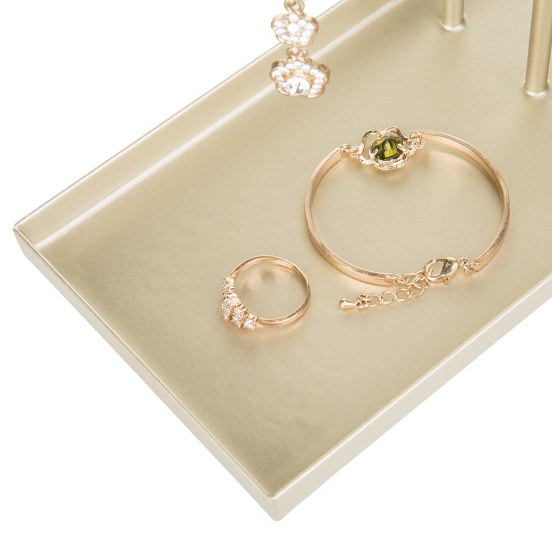 Features 3 tiered bars for hanging necklaces, bracelets, and watches with a rectangular base ring tray