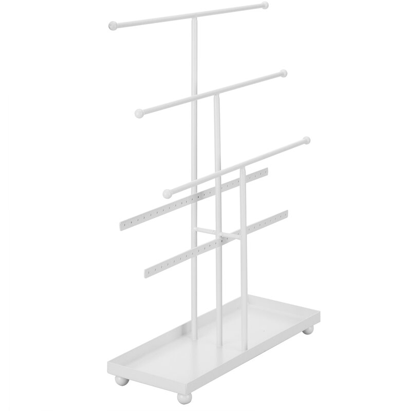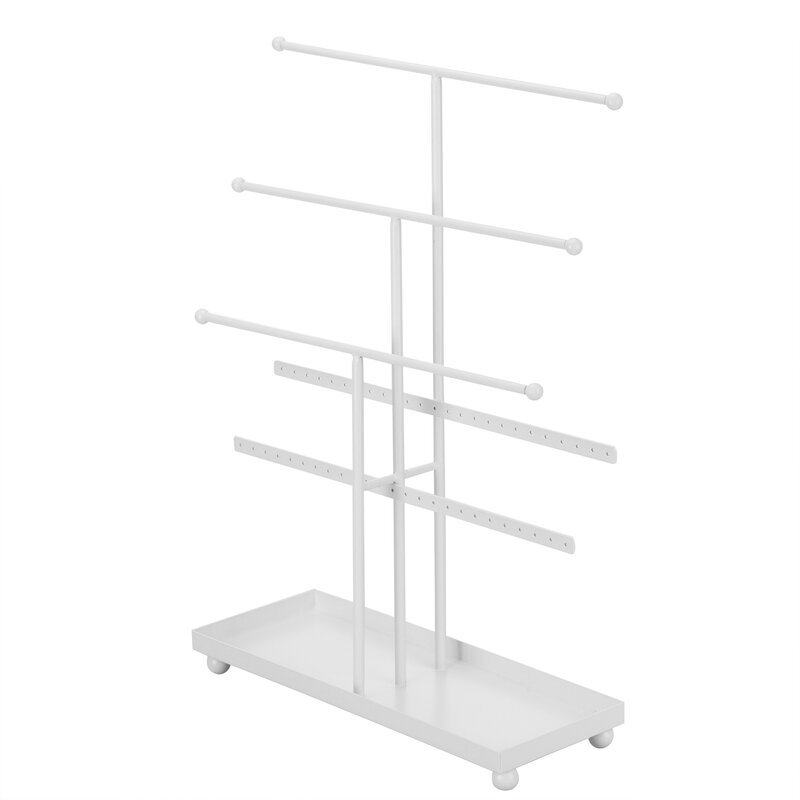 Keep your jewelry organized and looking stylish with this tabletop display rack. This rack features 3 ball-tipped bars for hanging necklaces and bracelets and 2 bars for storing up to 18 pairs of earrings. The tray at the base of the storage rack is great for storing rings, pins, and other small accessories. Perfect for display in your home, salon, boutique, or retail store. Takes up minimal space on a table or countertop surface, and is an excellent complement to rustic decors. Use these jewelry organizers separately to bring storage to many spaces in your home or store or arrange them together in height order to add visual interest to your jewelry display.