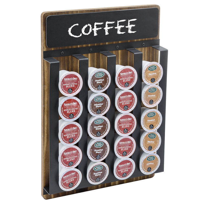 Add style and function to any coffee area in your bed and breakfast, office space or hotel lobby with this burnt wood coffee pod storage rack with white cursive Chalkboard Label. The sturdy solid wood construction holds up to 20 coffee pod capsules in the 4 separate columns while highlighting them and making selection easy.