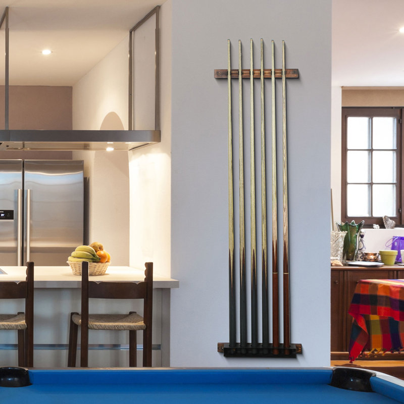 Perfect to mount on the wall surface as an ideal rack to display your collection of billiards pool cue sticks, this rack can be an excellent decor in your living room, bedroom or bar area. It can also keep billiards pool cue sticks accessible easily and never go missing when it is time to play. Featuring the dark brown wood construction, this wall-mounted rack will provide a perfect display of 6 billiards pool cue sticks. The 6 circular shelf cutouts keep billiards pool cue sticks securely held in place, and you can mount this rack on the wall surfaces with the proper hardware. This wall-mounted bark brown billiards pool cue sticks rack will add a touch of rustic style to your living space, as well as go well with the country-themed furniture.