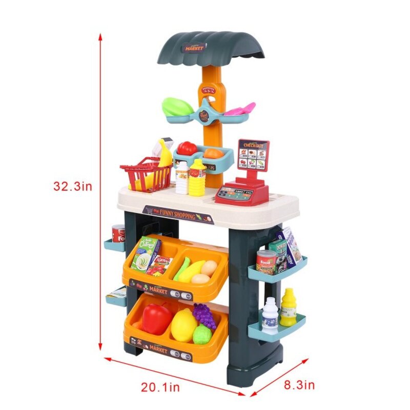 Credit card machine and a variety of fruits and unique scan able food & accessories that are recognized by the checkout.