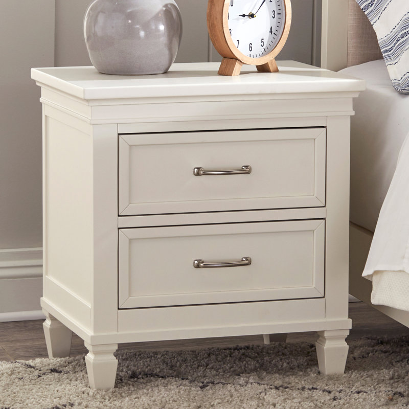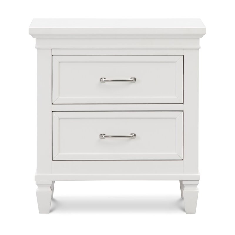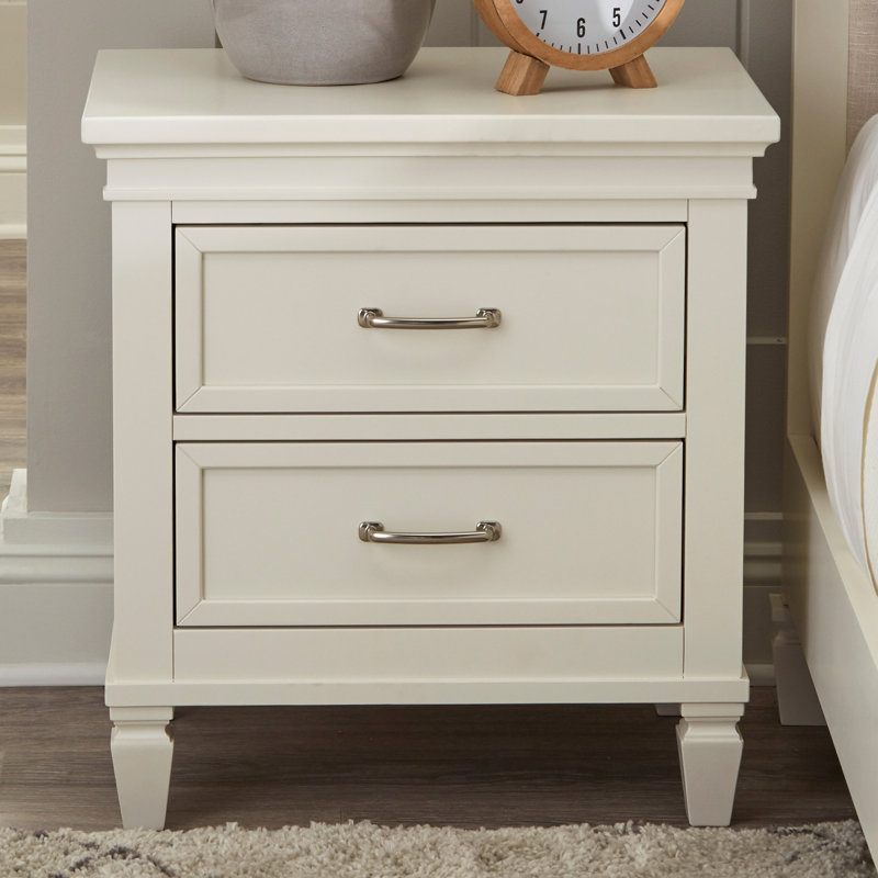Bring the elegance of romantic French country inspired style into the home with the Darlington Nightstand. The nightstand balances classic raised molding, delicate tapered feet, and accent satin nickel drawer handles. Both spacious drawers feature dovetail construction with self-closing, ball-bearing drawer glides. Available in a Warm White finish.