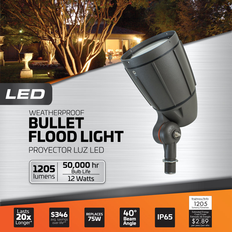Illuminate the outside of your home at night with the warm glow of 3000K Soft White LED flood lights outdoors. This powerful lamp comes with a frosted lens, has a beam angle of 40 degrees, and lasts 20 times longer than a halogen flood light bulb. This outdoor lighting product is housed in heavy-duty, die-cast aluminum with a rust-resistant bronze finish. The 1205-lumen LED flood light bulb is rated to last for 50,000 hours of use. That means you could potentially use it for up to 22 years and yet only rack up an estimated energy cost of $2.89 per year.