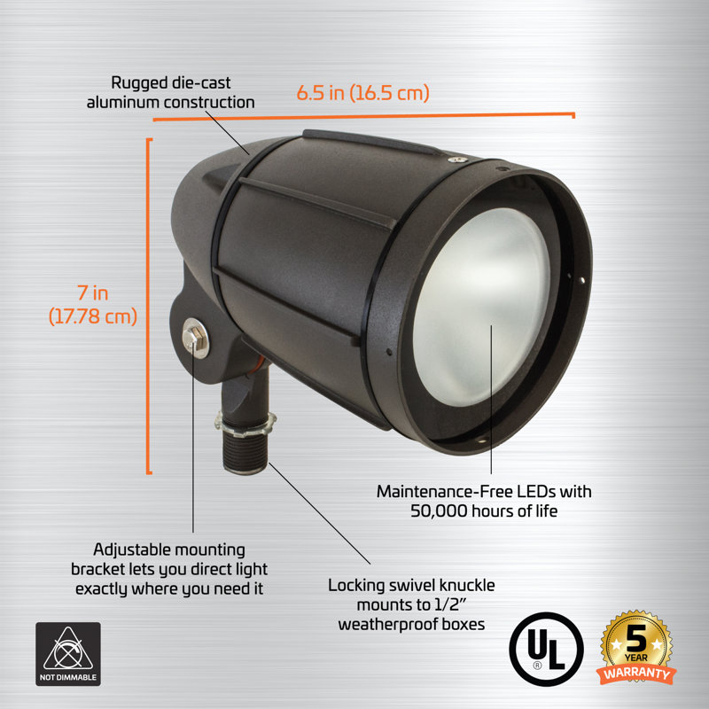 Get energy-efficient, heavy-duty outdoor illumination with our Integrated Outdoor LED Weatherproof Bullet Flood Light with Adjustable Mounting Bracket. It’s fixed to an adjustable mounting bracket that allows you to direct the light exactly where you need it. It mounts securely to 1/2-in. weatherproof boxes.