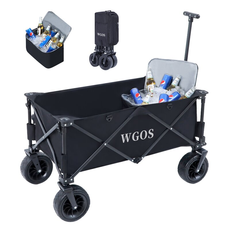 The all-direction folding adjustable wagon will make your life easier. It comes with a detachable cooler bag, an adjustable handlebar, and two cup holders. You could bring all the staff with you in this wagon! Featuring heavy-duty steel and industrial-grade Oxford 600D polyester mesh which can hold up to 150lb. The detachable cooler bag will keep you away from melted iced cubes and room Temperature drinks any more! The cooler bag will always keep your drinks and food cold and fresh.