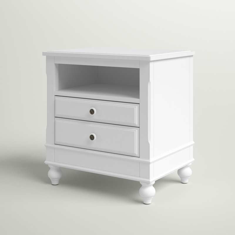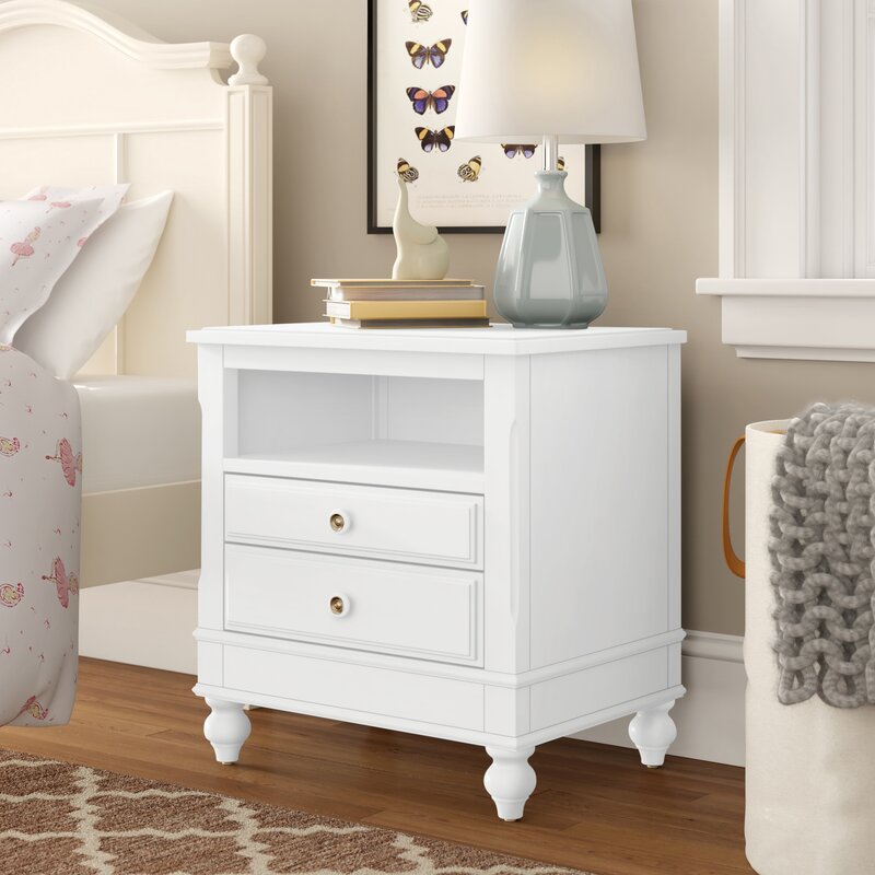 This classic nightstand offers plenty of bedside storage for your little one’s books and devices. The frame is crafted from solid wood, and it’s built on top of turned bun feet that work well in any traditional setting. Two front drawers and one hidden drawer on the left side open on ball-bearing glides, allowing you to tuck away loose odds and ends. It also features an open shelf for added storage space. We love how the weathered finish gives it a vintage-inspired feel. Plus, the surface top on this nightstand is ideal for a lamp or framed photo.