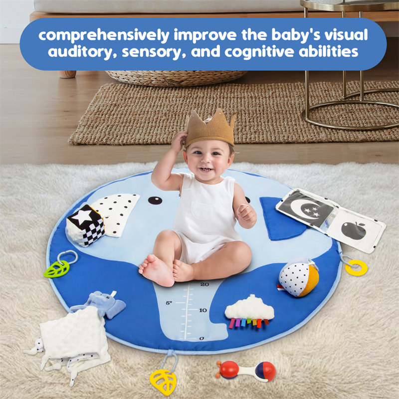 The baby gym play mat is made of high-quality fabric, thick and delicate to the touch. It is safe and comfortable for the baby’s skin. The bottom is a non-slip design. It is machine washable. The elephant security blanket can comfort the baby’s emotions very well. The soft mat provides the ultimate cloud-like comfort.