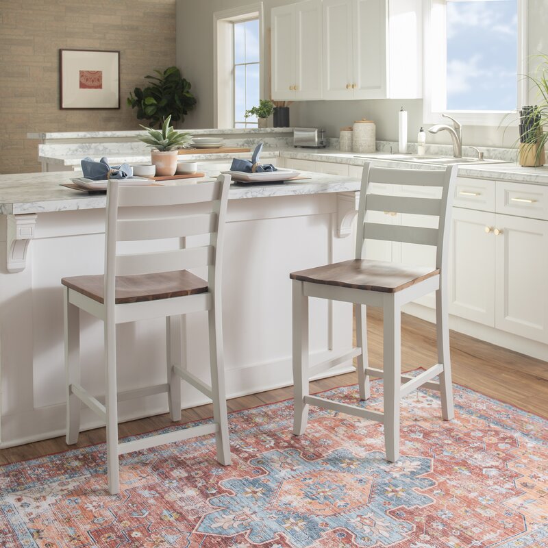 Classic design and a two-tone contrasting finish give this 2-piece pair of counter-height dining stools a timeless look that adds warmth and charm to any setting. Crafted with a solid rubberwood frame in a sleek finish, these bar stools have a versatile ladderback design that’s easy to pair with spaces of all sorts. We especially love the contrast of the solid acacia wood seat, which has a neutral finish that shows off the wood’s grain color variation. These stools require assembly upon arrival and accommodate 275 lbs each.