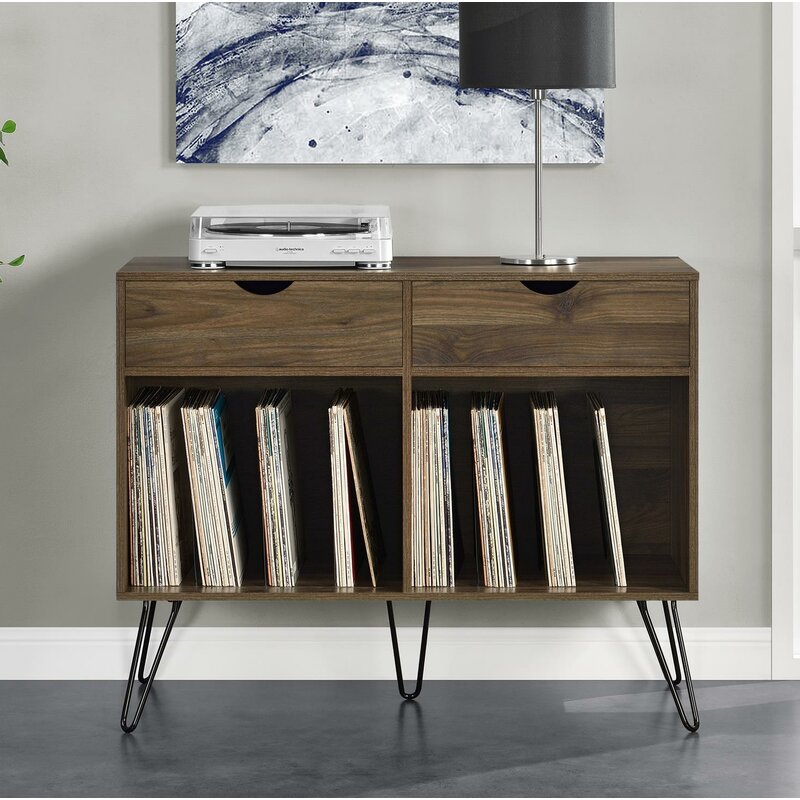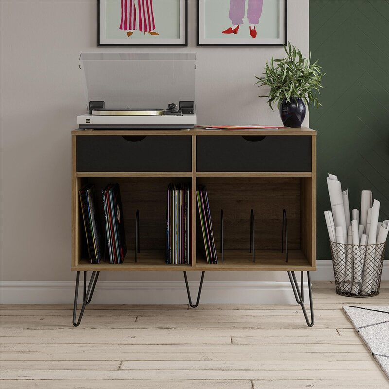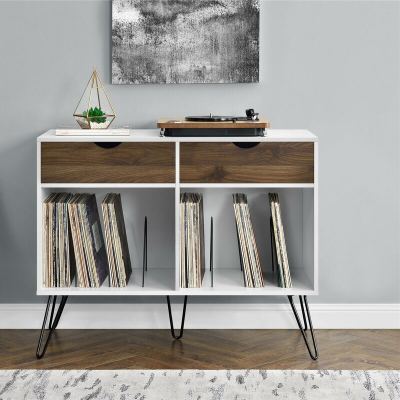 Add a blast from the past with the Novogratz concord turntable stand with drawers. Inspired by mid-century design, the laminated particleboard and MDF complement the black metal hairpin legs for a fun retro look. The medium brown or white wood grain finish pairs well with any décor from modern to classic. The double-wide stand offers plenty of space to place a record player, speakers, stereo, or even decorations. Keep your remotes, cassette tapes, and record mats or weights for your singles stored away and organized in the 2 drawers. The drawer cutout gives the stand a clean, No-handle look that is easy to open. Keep all of your albums organized in large open cubbies that feature metal record dividers to keep all of your albums upright. The Novogratz concord turntable stand with drawers ships flat to your door and 2 adults are recommended for assembly upon opening. The stand can hold up to 60 lbs. while the cubbies will hold 20 lbs. each. Each drawer can hold up to 15 lbs.
